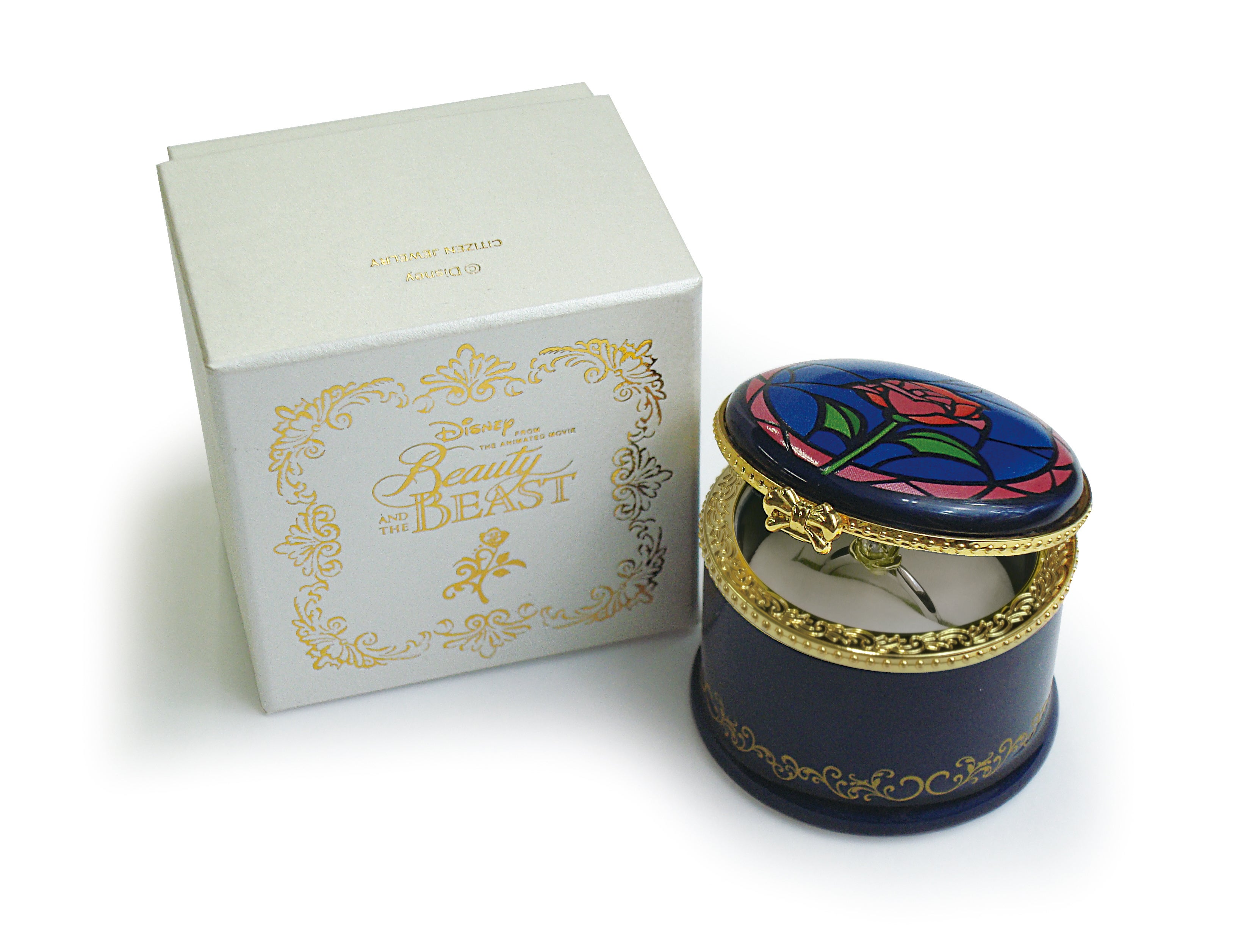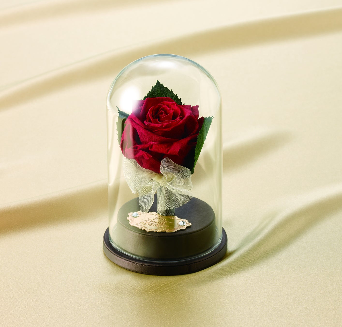 - 3点以上ご成約でプレゼント。「美女と野獣」を語る上ではずせない象徴的アイコン[魔法の薔薇]。プリザーブドフラワーを使用したオブジェは、台座のロゴプレートに取り付けられたラインストーンでリングピローとしてもお使いいただけます。
