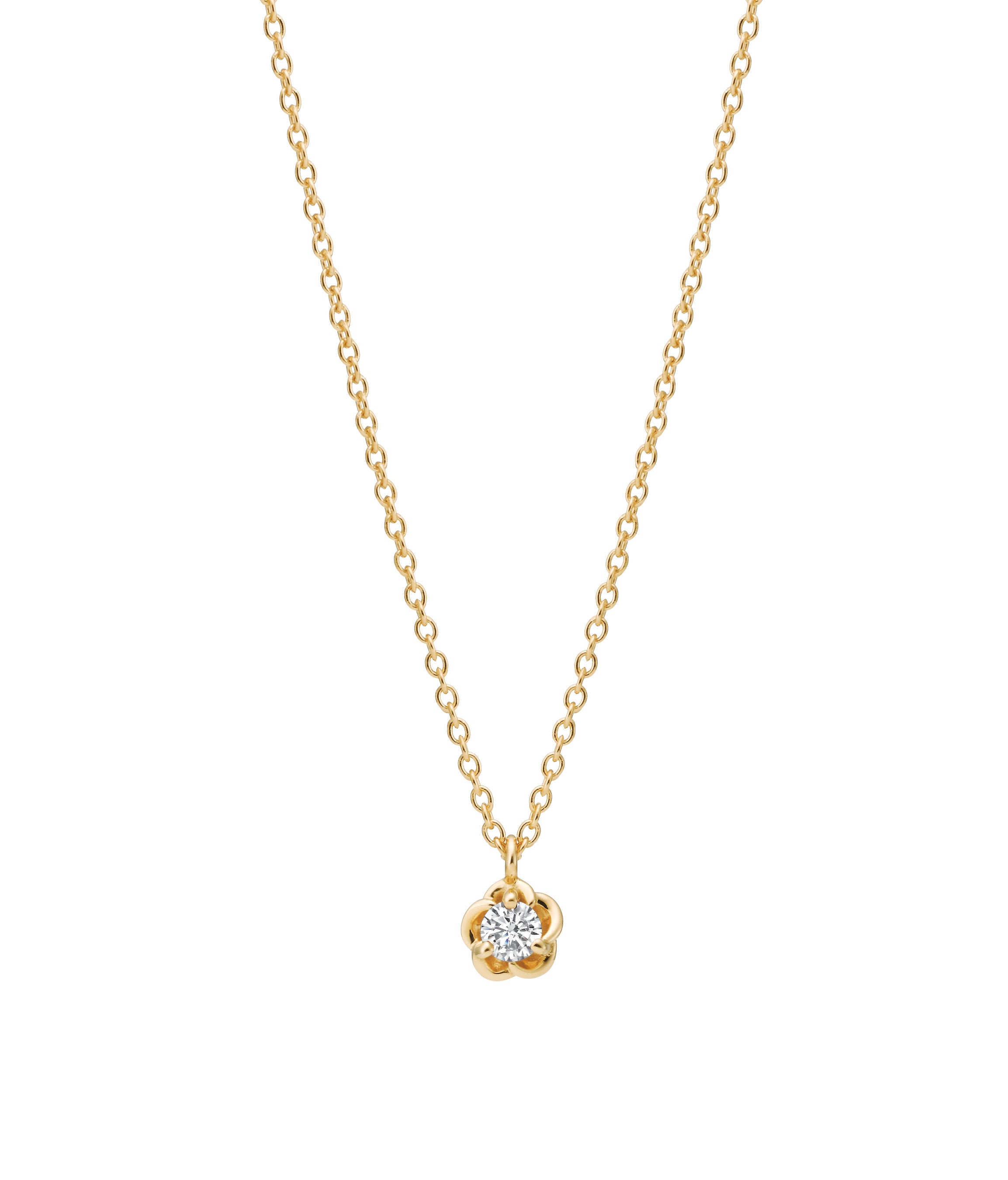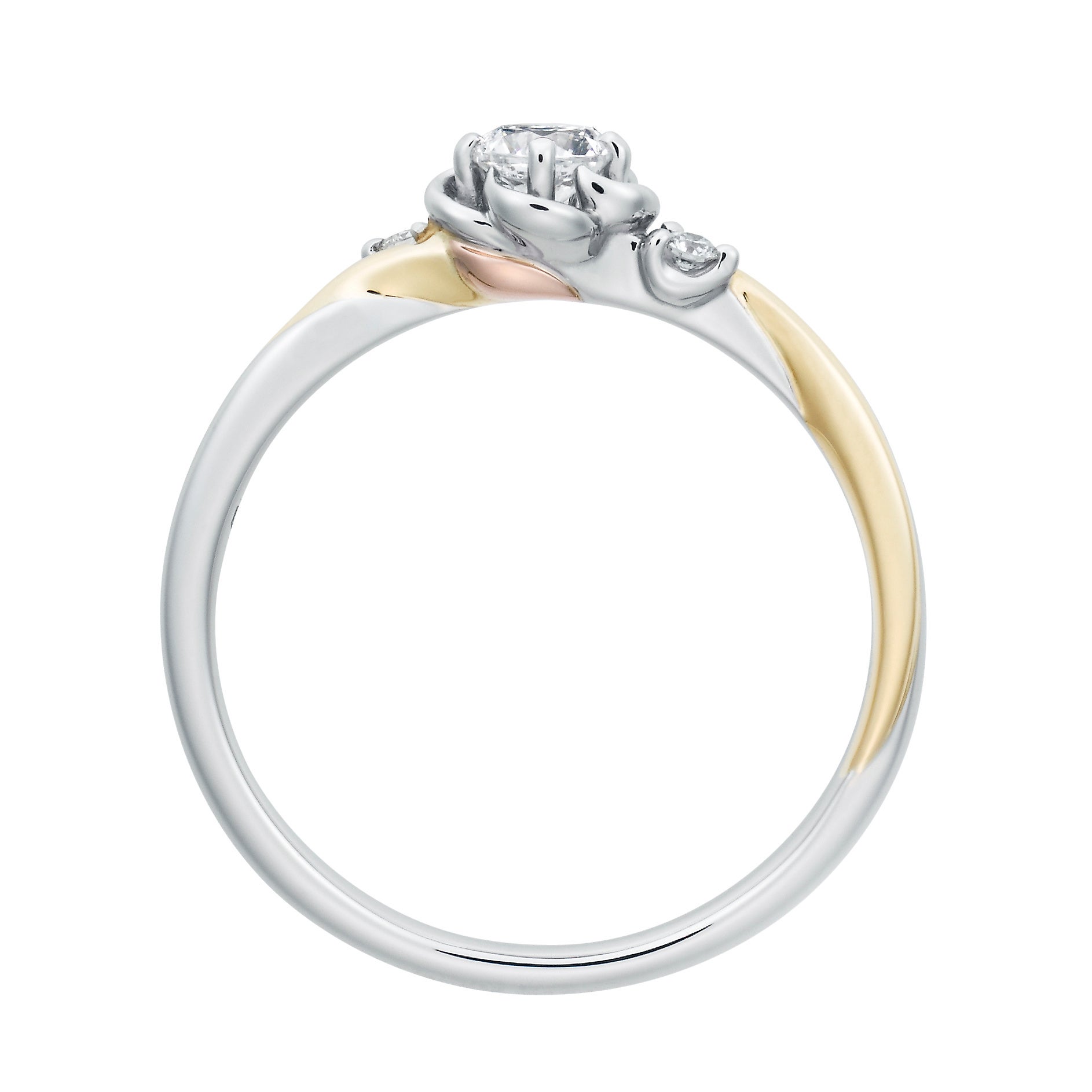 - 薔薇型石座の上にダイヤモンドを持ち上げるようにセッティングすることで、ダイヤモンドにたっぷりと光が入り込み、美しく輝きを放ちます。側面にはひらりと落ちていく薔薇の花びらをイメージしたピンクゴールドがワンポイントになっています。
