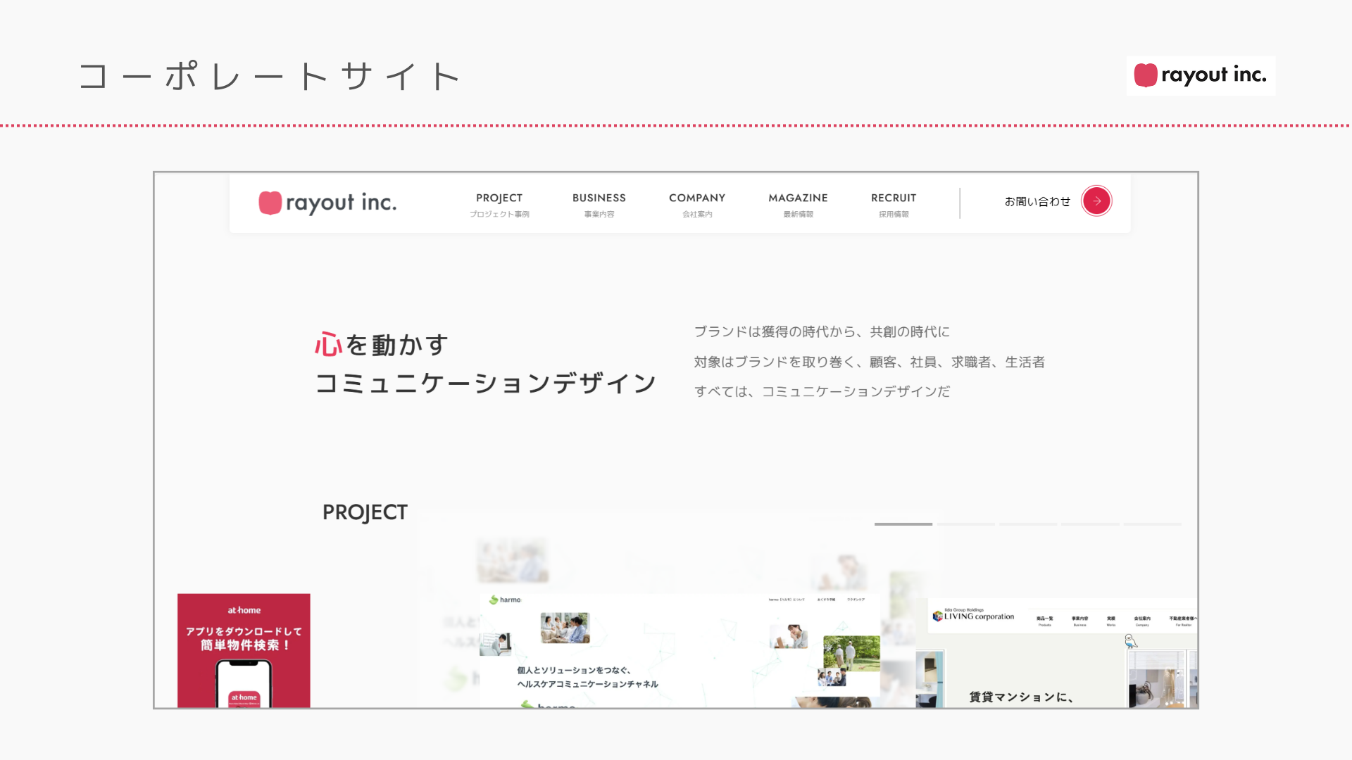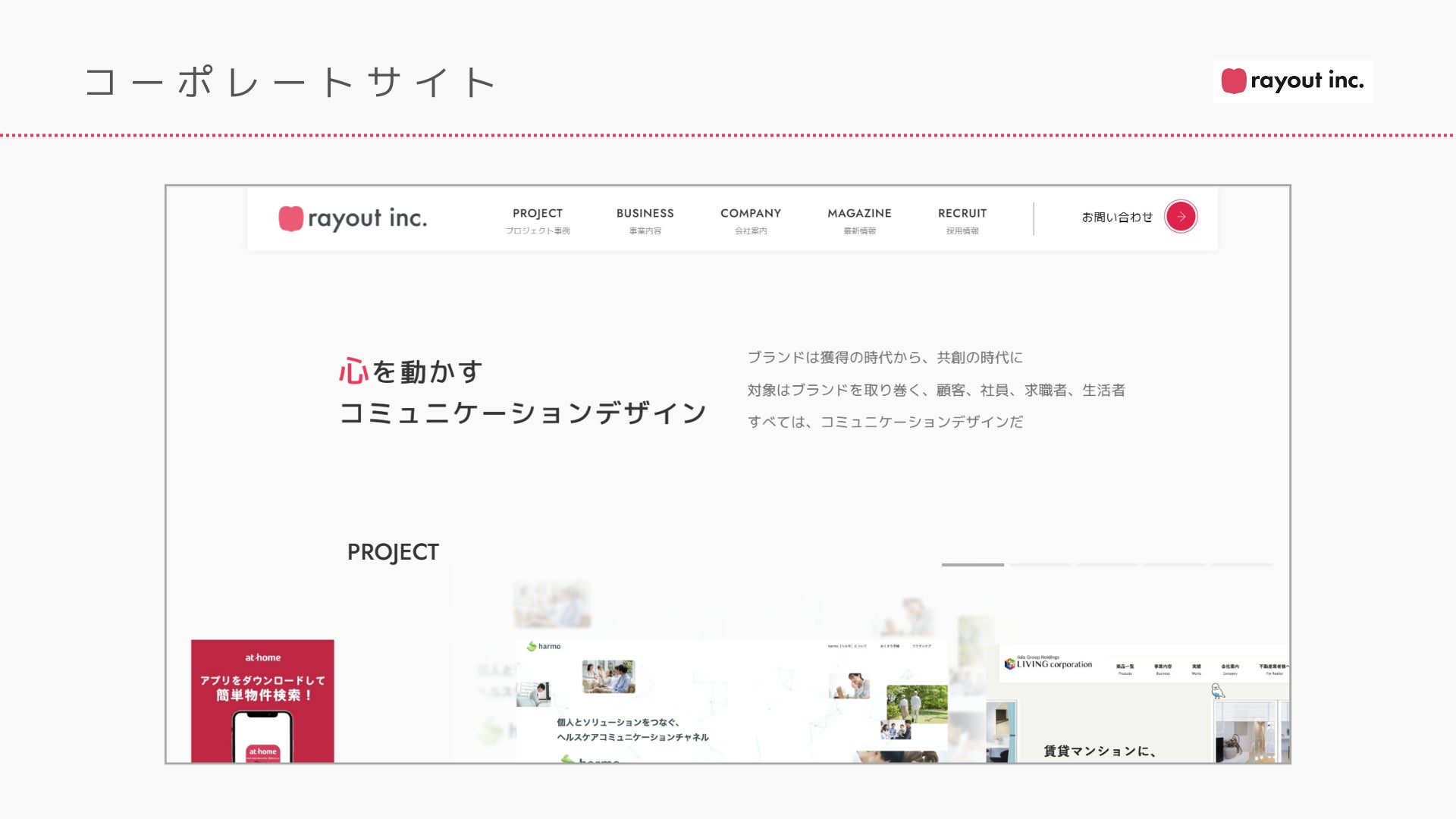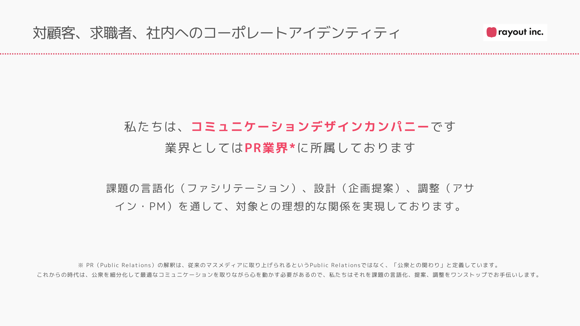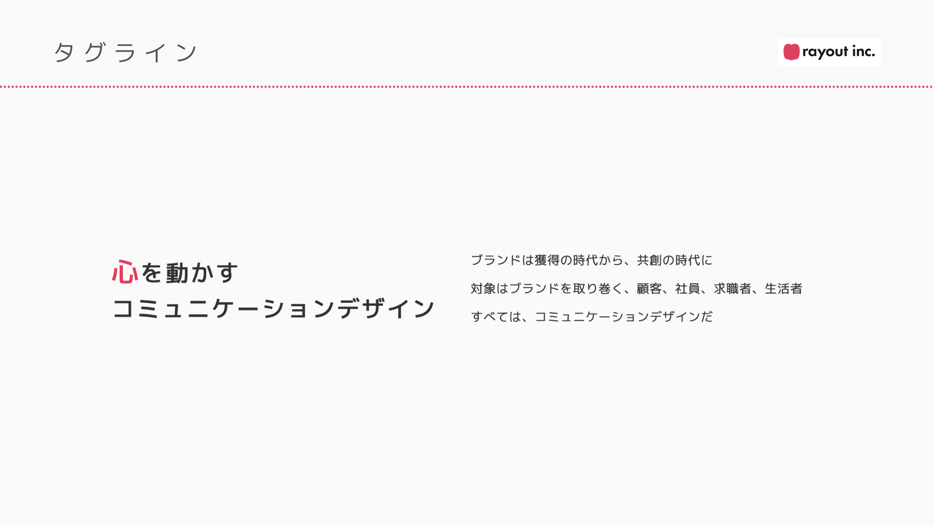 また、お客様と関り合う全てのシーンにおいて「誰かの心を動かしているか?」という意識を常に持ち、「人の心を動かすコミュニケーションデザイン」こそrayoutのユニークさだという認識を印象付けます。