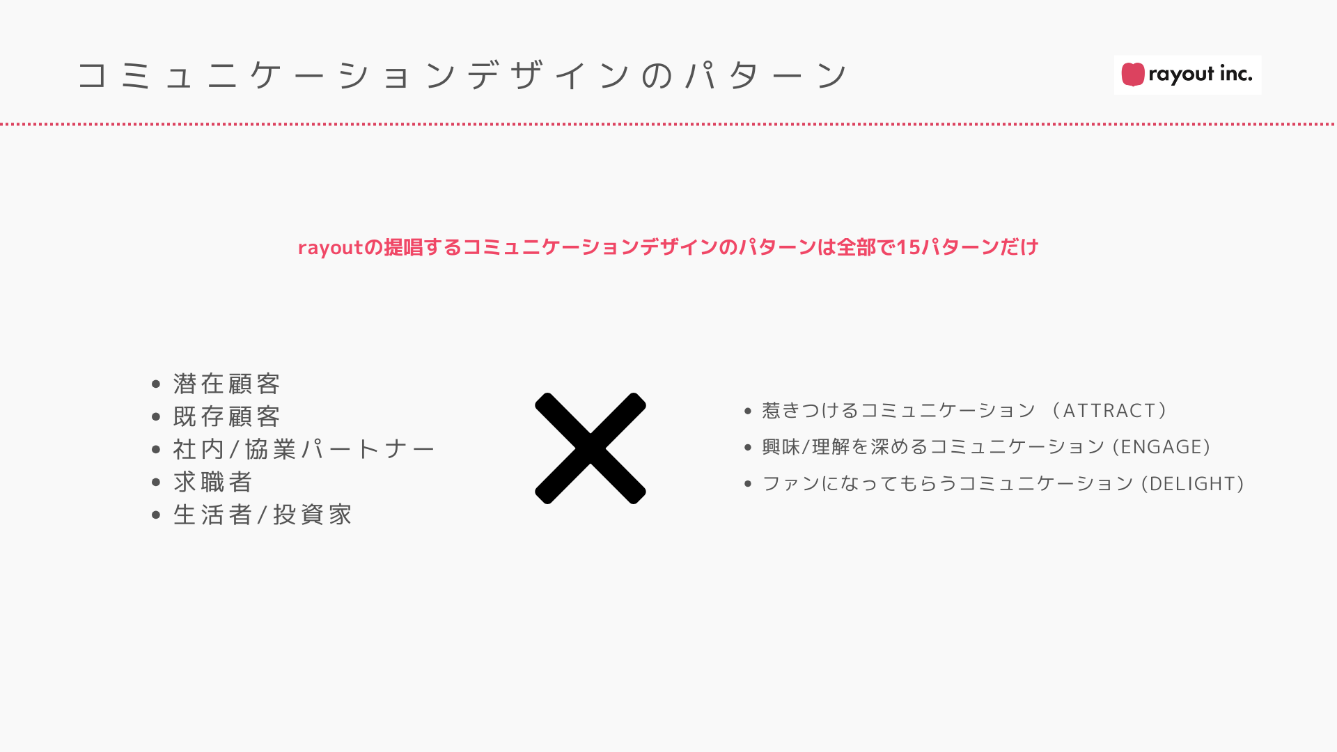 rayoutが提唱するコミュニケーションデザインは15パターンのみ。アプローチしたいステークホルダーと、課題や目指す姿から必要となるコミュニケーションの形です。