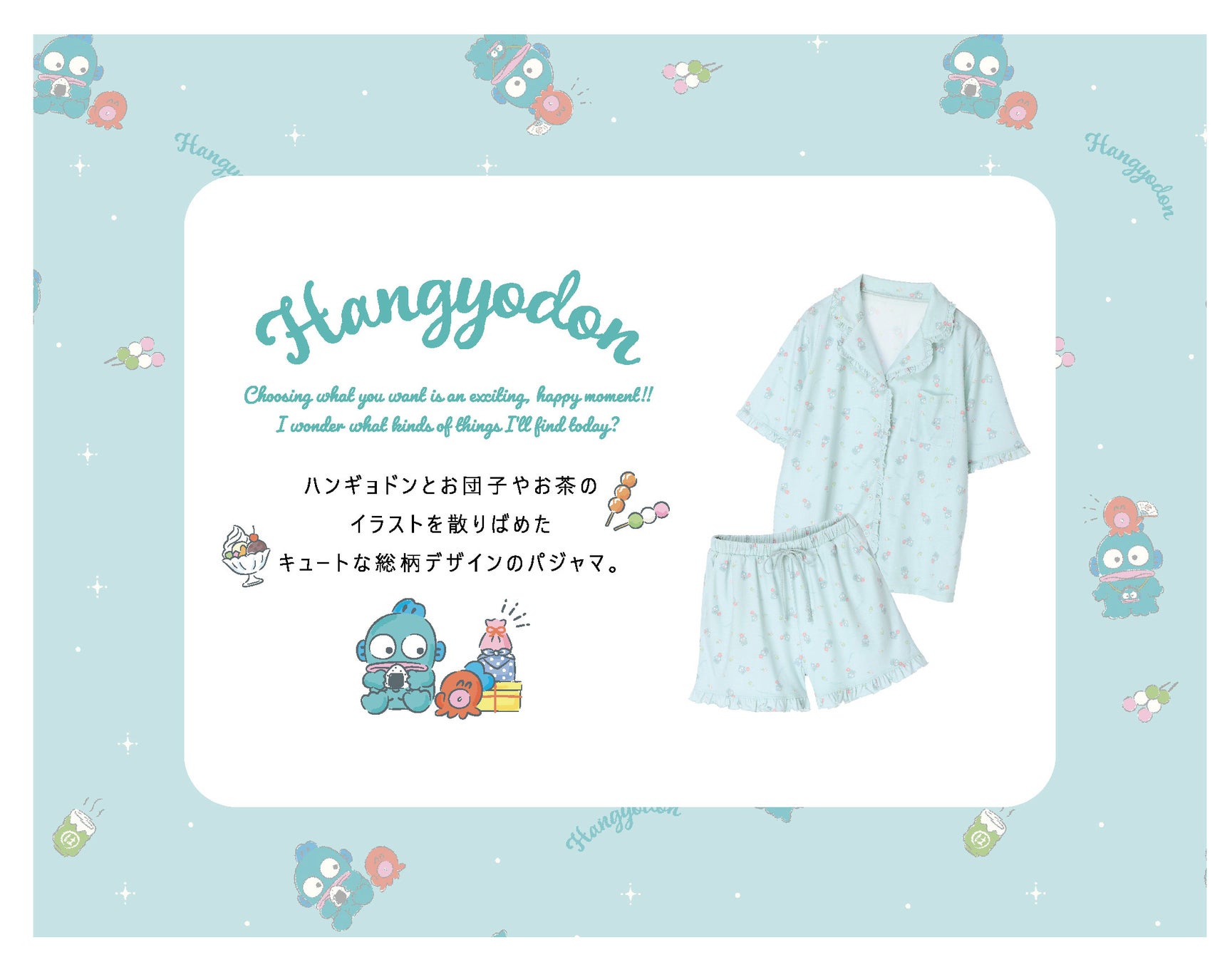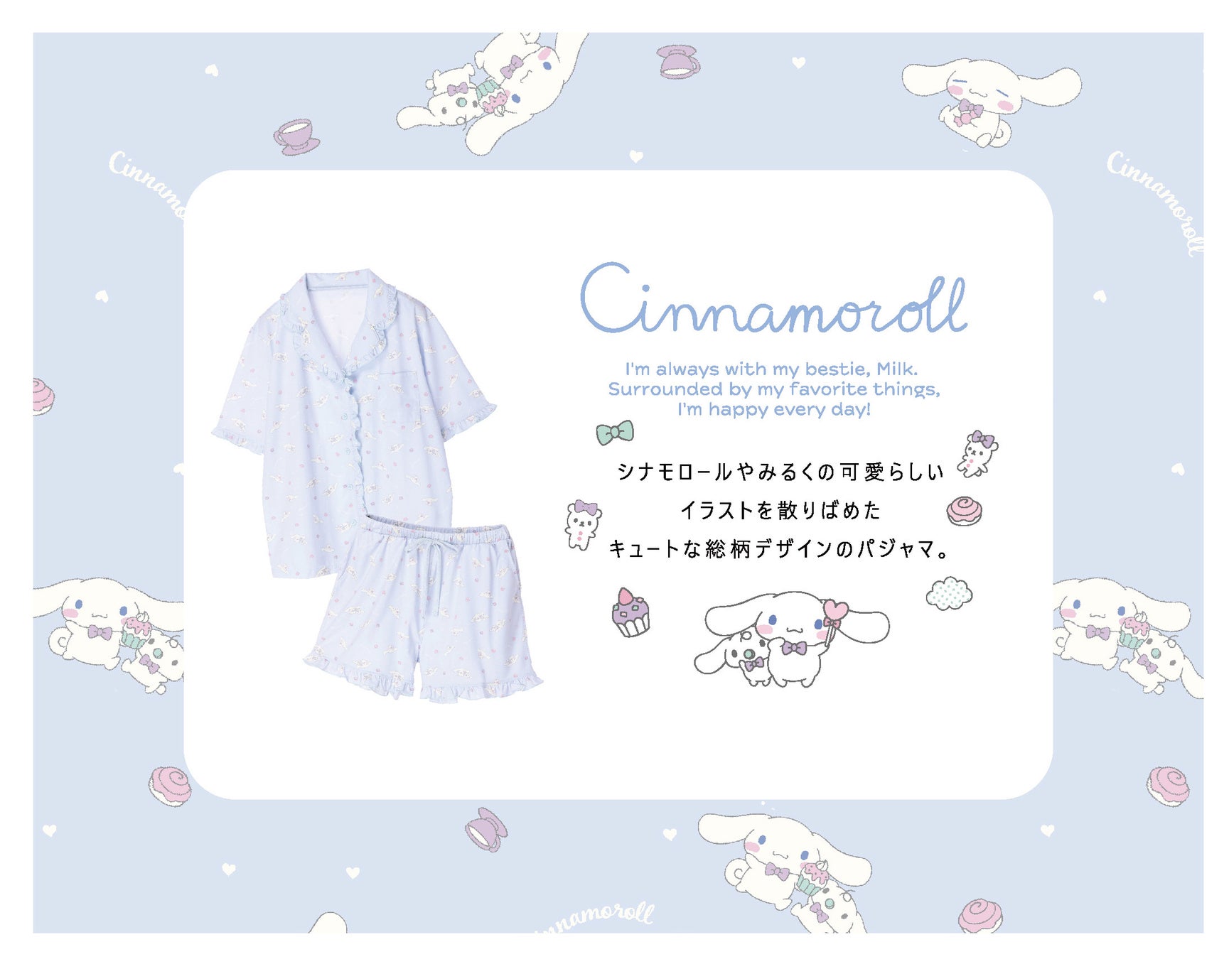 サンリオキャラクターズ総柄パジャマは衿まわり、袖口やパンツ裾についたフリルがポイント!