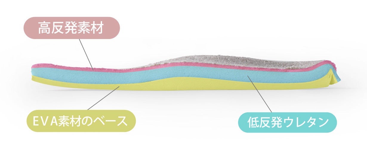 形状を維持する「EVA素材」柔らかく足を包んでくれる「低反発ウレタン」「高反発素材」からなる『立体3層構造』を採用しています。