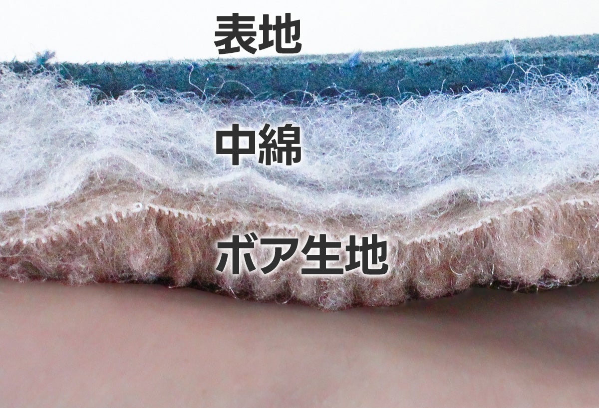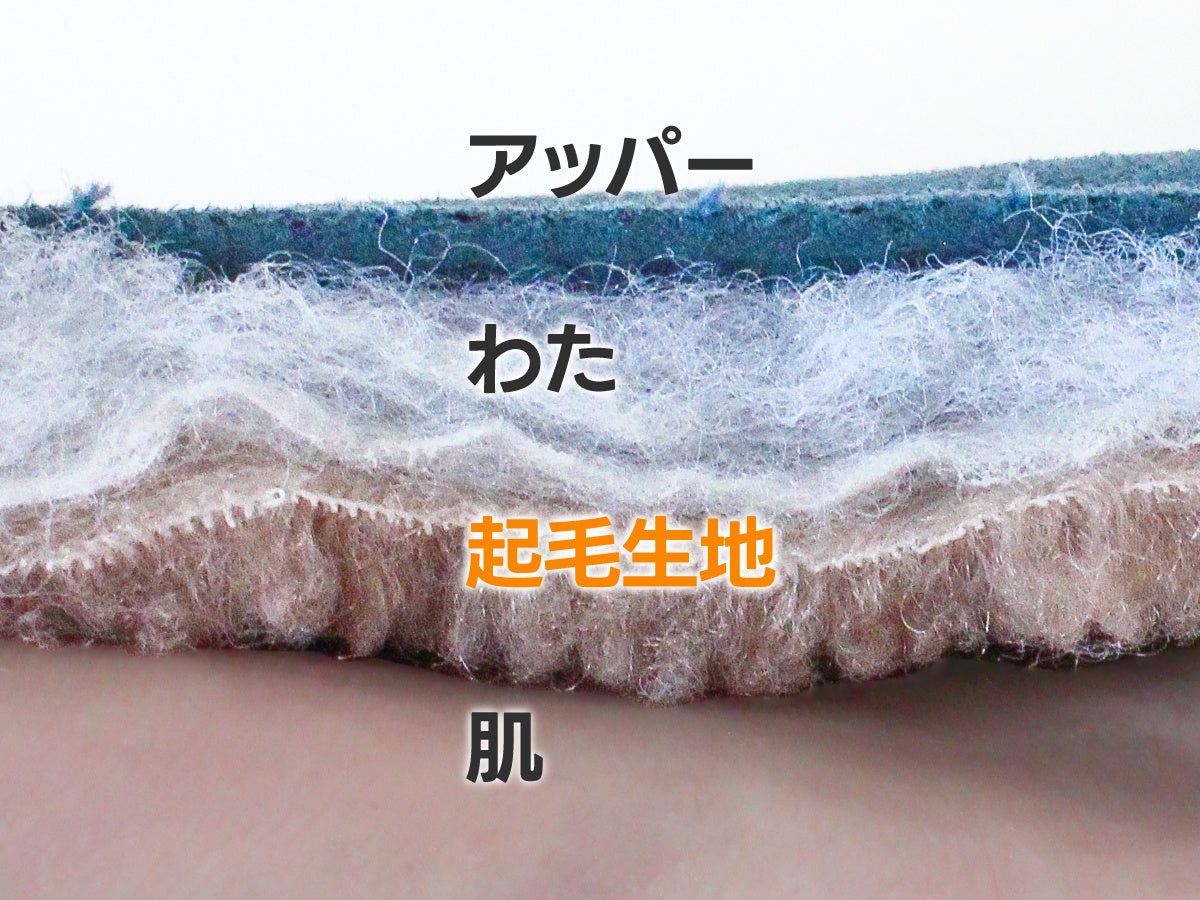 +6℃の極保温性能の秘密は、足首からつま先までを包み込む“ボア生地”+ぎっしり詰まった“中綿”さらに、“起毛素材に包まれた厚めの中敷き”にあります。
