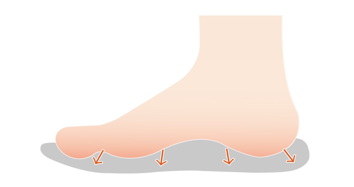 一般的なインソールは平面であるのに対し、リゲッパモーフに採用しているアーチサポートインソールは人間工学に基づいて設計されており、「土踏まず」「足裏のくぼみ」「かかとまわり」をはじめ、足裏とインソールの隙間を埋めるようにバランスよく支えることで、体重の負担を足裏全体に分散します。