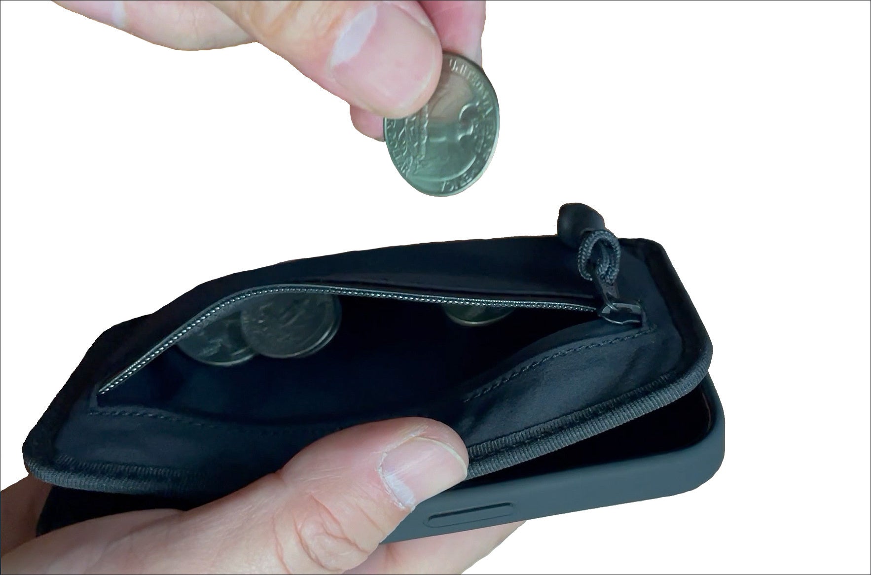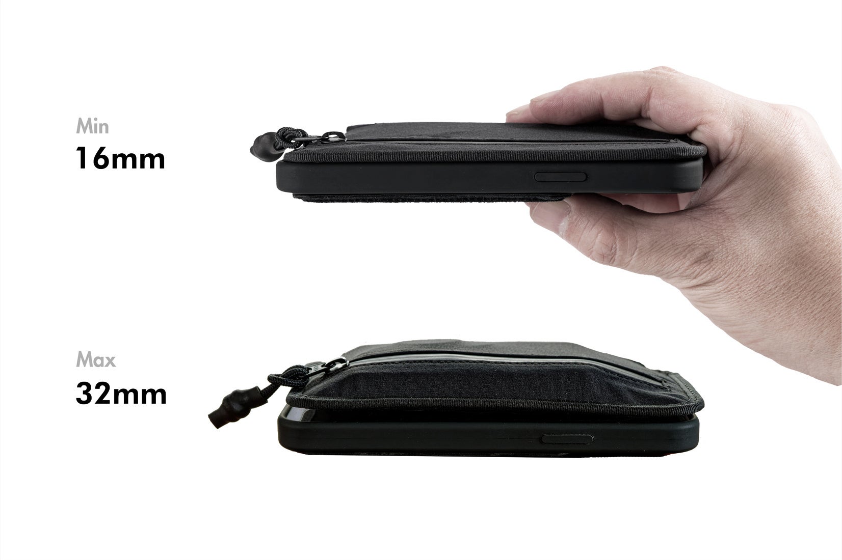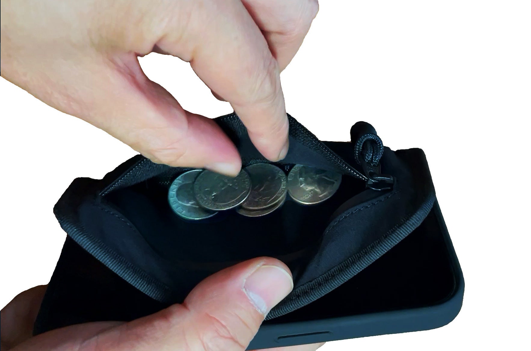 ストレッチ素材のため開口部が大きくガバッと開きます。財布一体型の多くは、小銭の収納スペースはあるが製品が厚いものや、カード類は収納できるけど小銭の収納スペースがなく製品が薄いものになります。小銭も入れたいけど分厚いケースは持ちたくないから財布一体型のケースを諦めている方は多いのではないでしょうか。Wrapupは表面のファスナーを開き開口部を広げると、伸縮性の素材により伸びながら広がります。ポケットの中身がよく見えて、サクッと小銭の出し入れが可能です。 収納量により素材が伸縮するので、スリムかつ大容量の両立を実現しました。