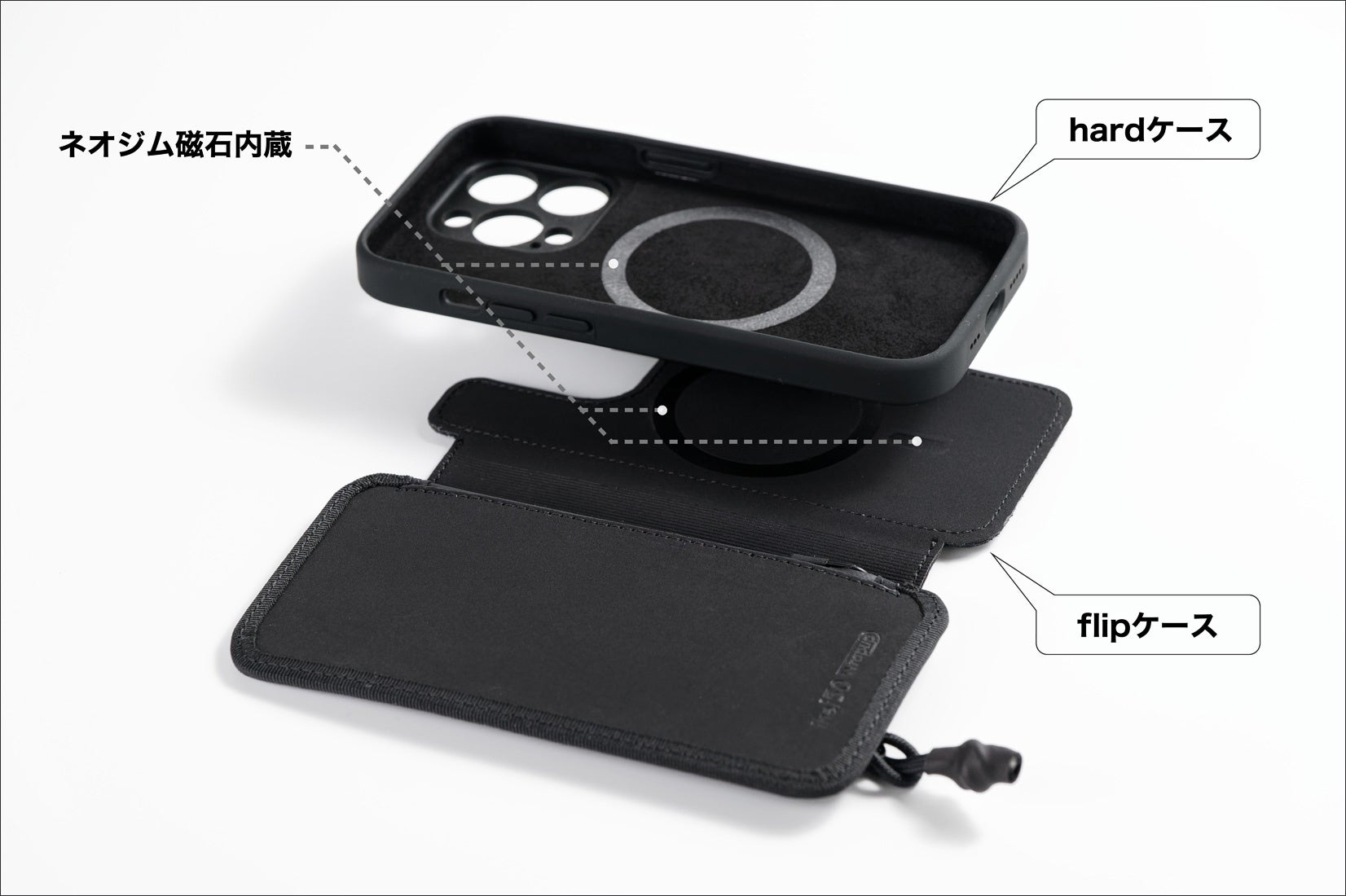 flip caseとhard caseは磁力により取外し、使い分けができるため様々なシーンで活用できます。外出時にはflip caseとしてカードや紙幣を持ち歩き、屋内ではhard caseとしてよりスリムに使用、またMagSafe対応充電器をhard case 背面に取付けるだけで充電が可能です。車載ホルダーにセットしてカーナビとしても使うことも簡単にできるので、オフィスからアウトドア、日常使いまで、多彩なシーンで最適です。強力なネオジム磁石だから密着力は抜群、MagSafe 充電器で高速ワイヤレス充電も可能です。