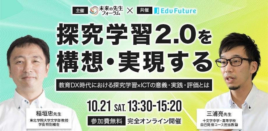未来の先生フォーラム主催、Edv Future共催のオンラインイベント「探究学習2.0を構想・実現する-教育DX時代における探究学習×ICTの意義・実践・評価とは-」を、10月21日(土)に開催します。