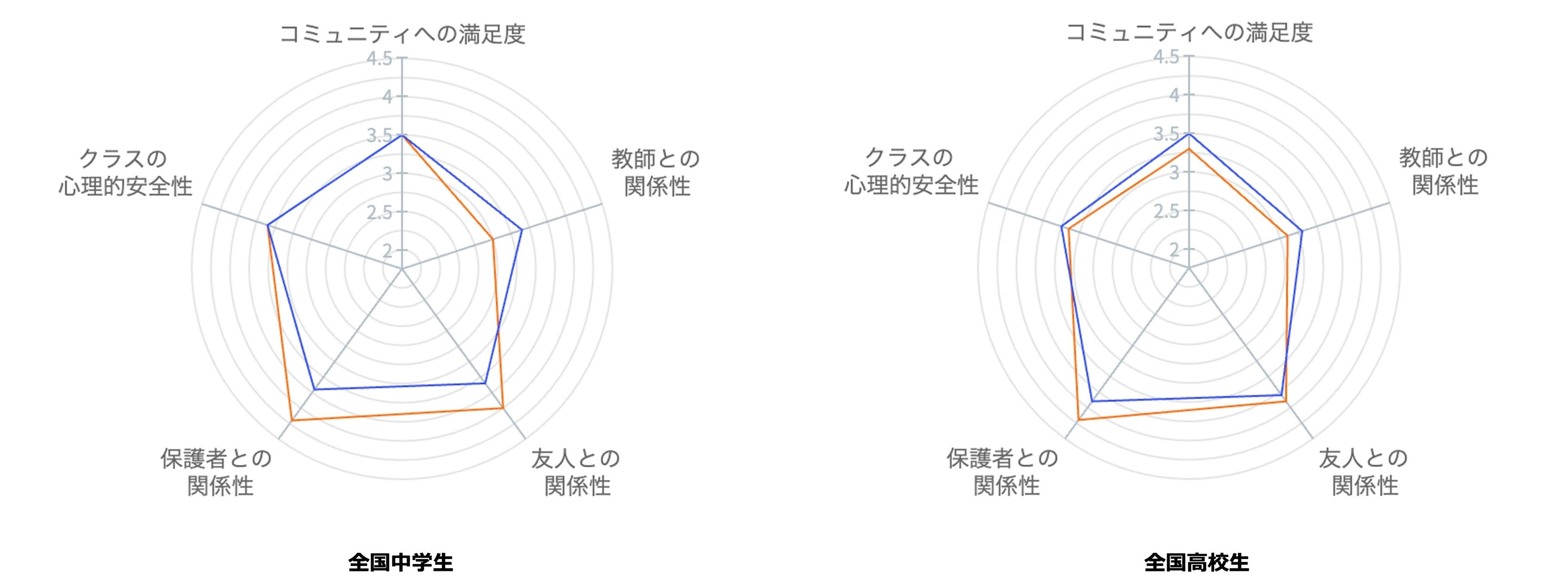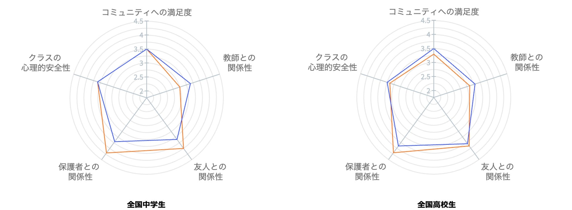 「周辺環境」のカテゴリでは、中学生・高校生ともに、通学期間と休み期間に応じた対人関係の違いが顕著に出ています。学外でのコミュニケーションが増え、家族・保護者や友人との関係性に伸びが見られました。