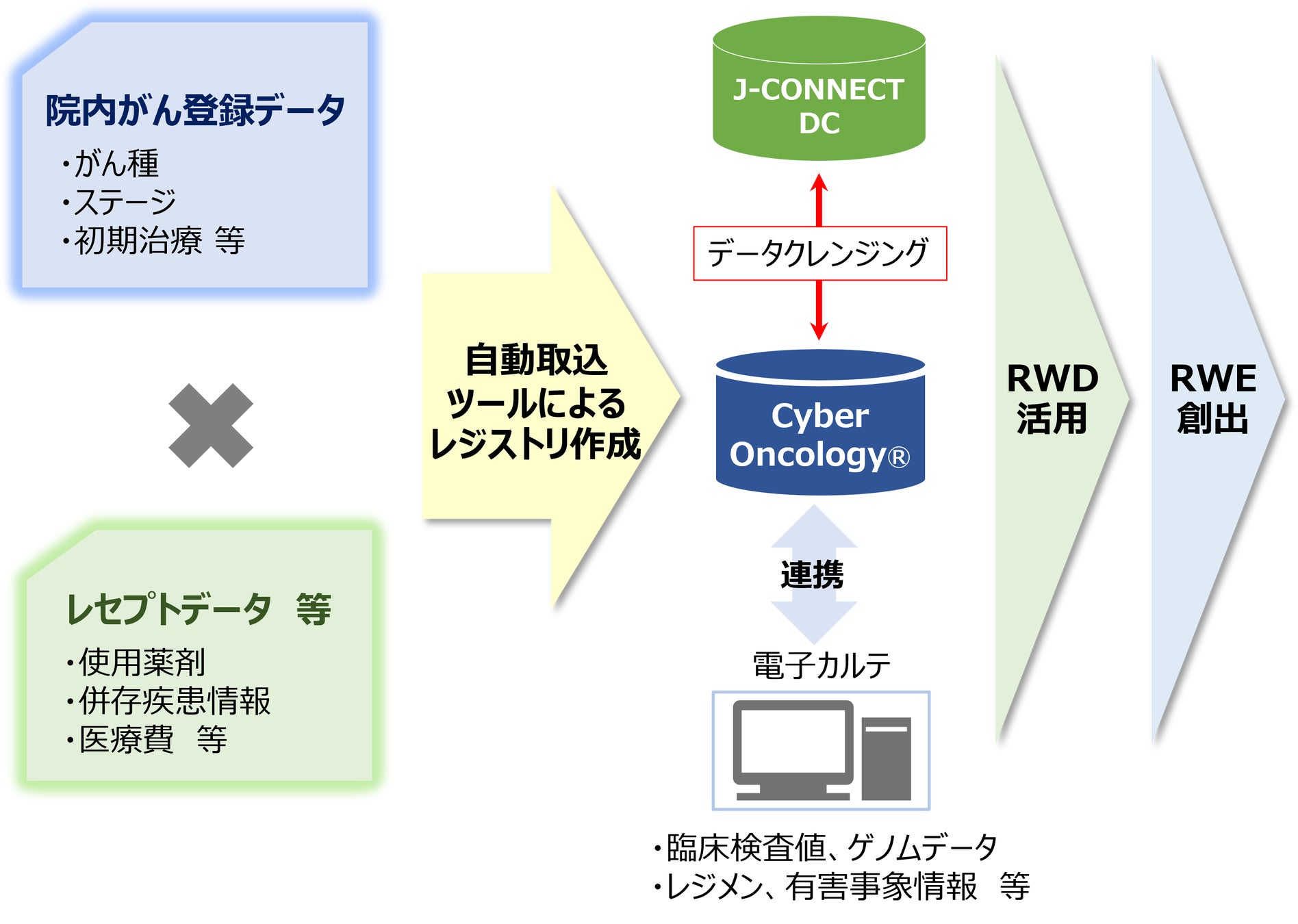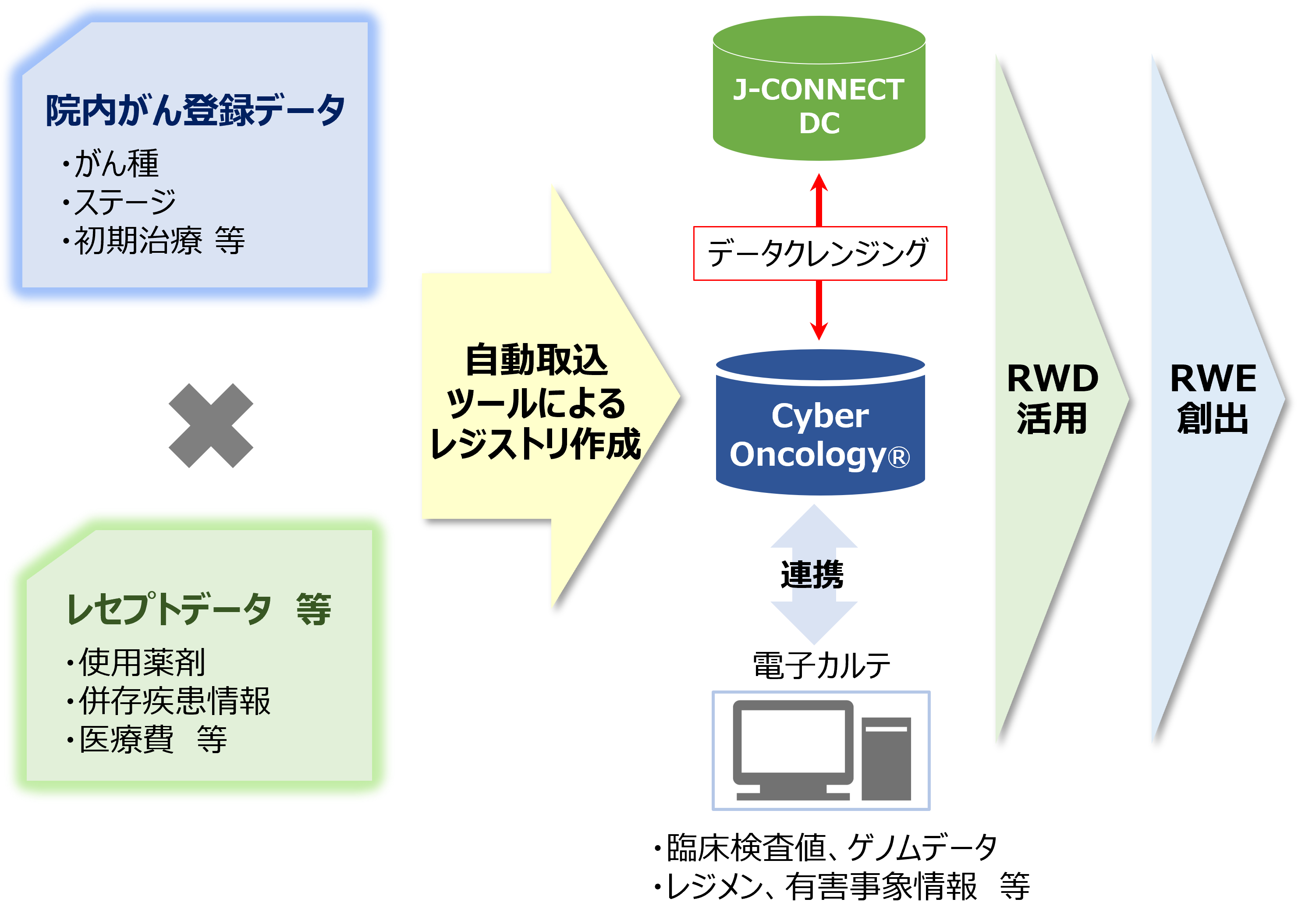 各施設が保有する院内がん登録データを自動取込ツールにより効率的にCyber Oncology®に移転するとともに、レセプトデータや電子カルテ由来の臨床検査値等を統合した、高品質かつ悉皆性の高いがん薬物治療に関する大規模RWDレジストリを構築します。