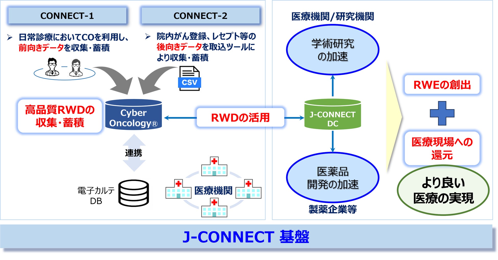 この度、こうした医療情報基盤を発展・継続させることを目的として、医療機関に加えて企業等の参画を募り、新たな研究基盤組織としてJ-CONNECTを創設し、従前からの取り組みである前向きRWD収集(CONNECT-1)に加え、「がん診療におけるRWDの網羅的収集及び利活用に関する多施設共同研究(CONNECT試験附随研究)」(以下、『CONNECT-2』)として、後向きRWDの収集を開始し、より悉皆性の高いRWDの収集を実現します。