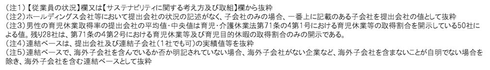 3指標(女性管理職比率、男性の育児休業取得率、男女間賃金差異)の実績値については提出会社での開示が主な形態となっている一方、女性管理職比率については連結ベースで開示を行う企業が全体の2割程度存在する。人的資本の戦略については、企業が開示している割合が高い事項(ダイバーシティ等)と低い事項(サクセッション・人財ポートフォリオ等)の比率に差があった。また、16.0%の企業が人的資本に特化した会議体を設置している。