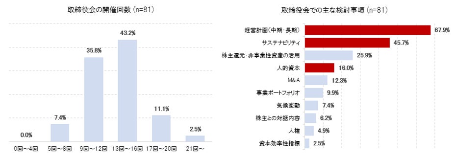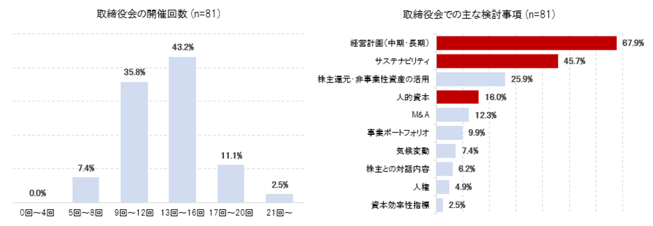 取締役会の開催回数は「13~16回」が最も多い結果となりました。取締役会での具体的な検討内容については、「経営計画(中期・長期)」について記載していた企業が67.9%、「サステナビリティ」「人的資本」について記載していた企業がそれぞれ45.7%、16.0%でした(図表6)。一方、東証が2023年3月末に上場企業に要請した内容とも関係する「事業ポートフォリオ」「株主との対話」「資本効率性指標」に関する記載は、9.9%、6.2%、2.5%と少数にとどまりました。