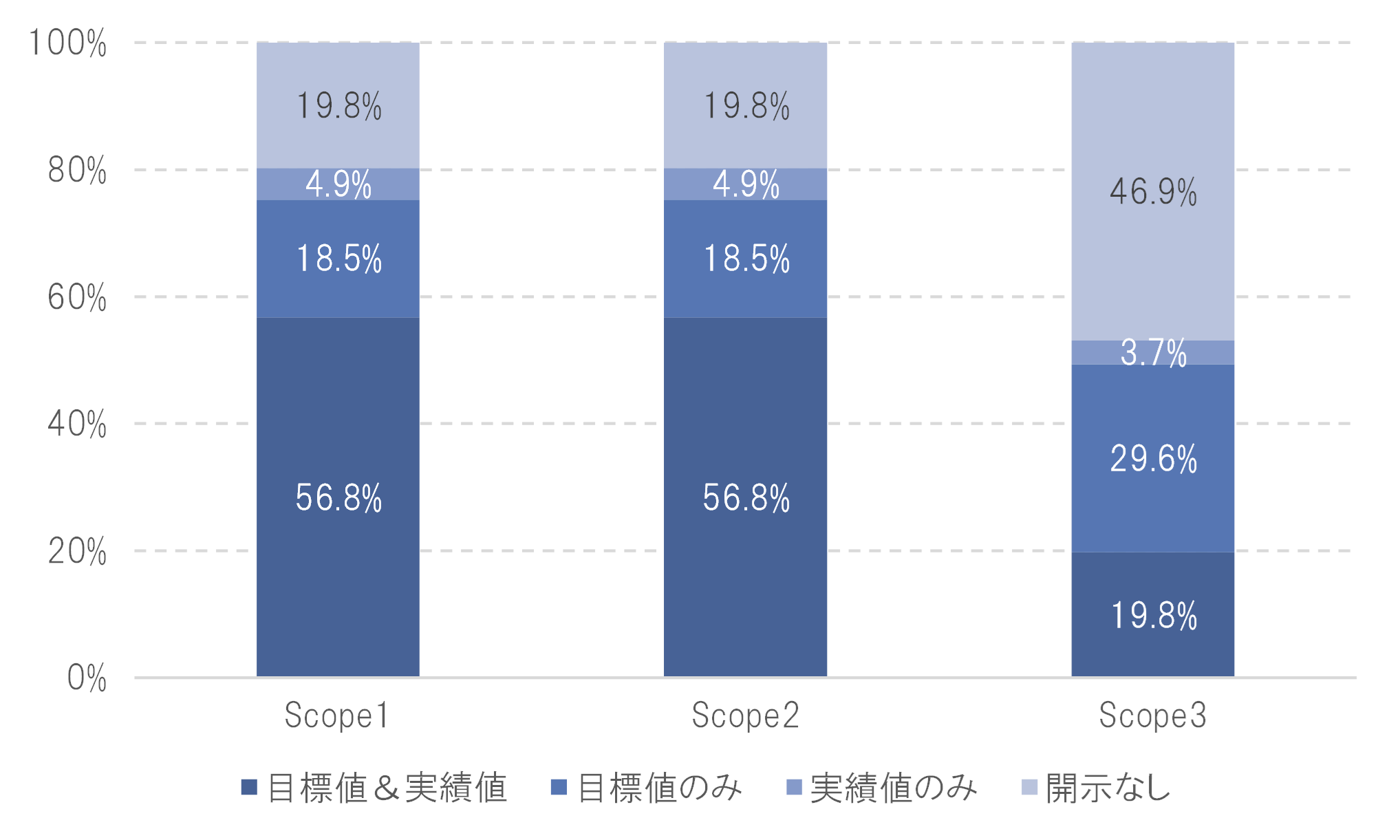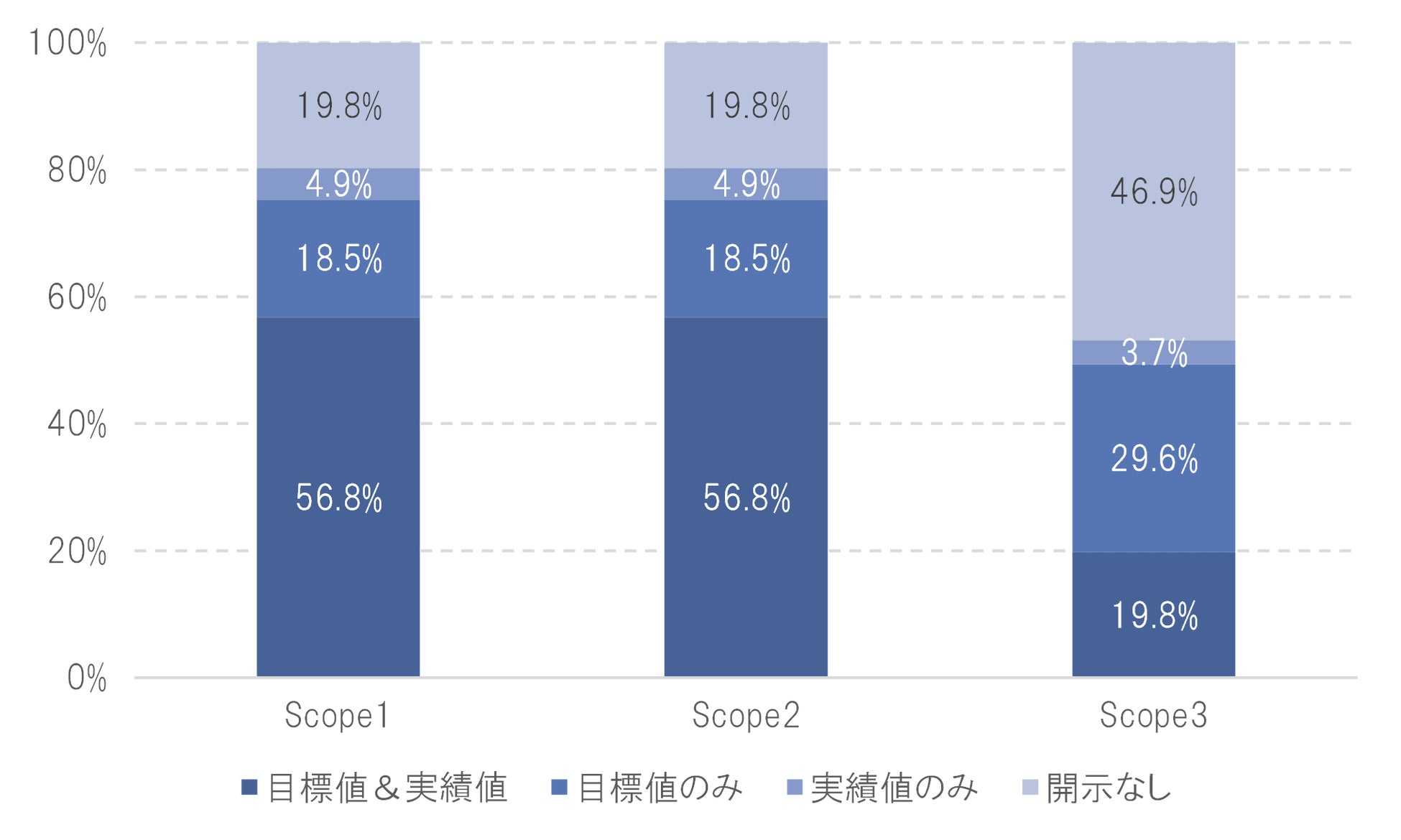 温室効果ガス(GHG)排出量の開示では、Scope3について実績値、目標値のいずれかを開示する企業は53.1%に達しました(図表3)。一方実績値、目標値の両方を開示する企業は19.8%にとどまるほか、GHG排出量についてScope1,2,3いずれかの実績値を開示する企業51社のうち、第三者保証に言及する割合は25.5%にとどまりました。
