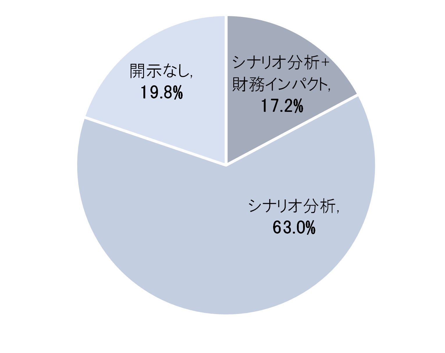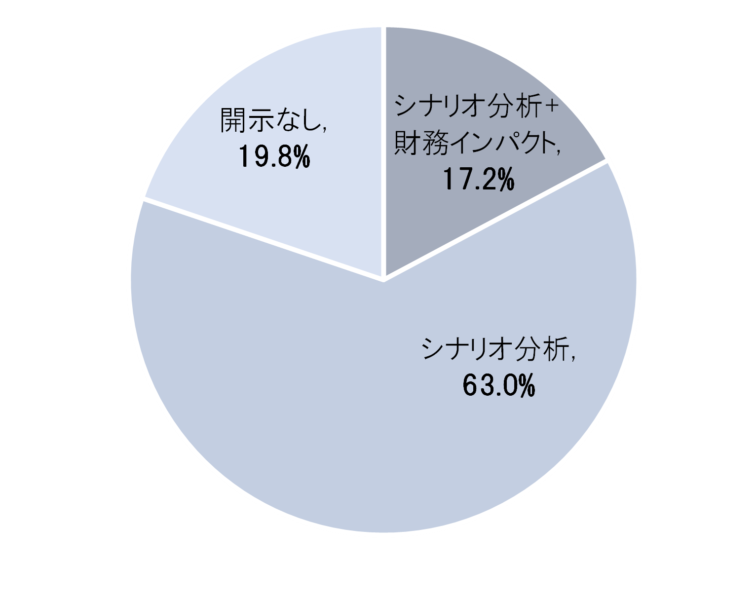 気候変動に対する取組みとして、「シナリオ分析」を実施している旨の開示が80.2%の企業でみられました(図表2)。シナリオ分析の実施を開示している企業のうち、気温上昇1.5度を想定してシナリオ分析を実施している旨の開示を行っている企業は60.0%にのぼります。一方、財務インパクトを具体的な数字を用いて開示している企業は17.2%にとどまりました。シナリオ分析を実施している企業と比較して、財務インパクトを具体的な数字を用いて開示している企業は少数にとどまりました。