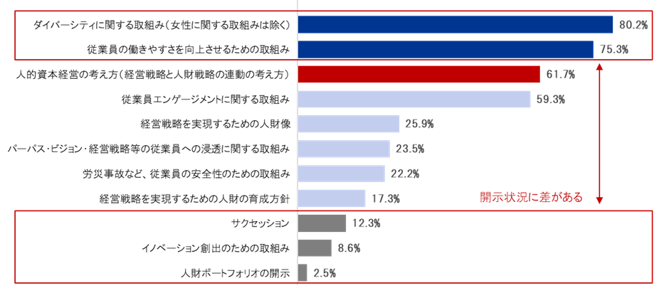 人的資本等に関する戦略の記載状況をみると、「人的資本経営(経営戦略と人財戦略の連動の考え方)」について記す企業は61.7%と多いものの、「経営戦略を実現するための人財像」および「人財の育成方針」に関する記載を行っている企業はそれぞれ25.9%、17.3%にとどまります(図表5)。また、経営戦略を実現するための「人財ポートフォリオの開示」を数値で示した企業は2.5%でした。企業が開示する割合が高い事項と低い事項に差があり、サクセッション・人財ポートフォリオ等(図表中:グレー)を開示している企業の割合が低く、従業員の働きやすさ・ダイバーシティ(図表中:濃紺)に関しては開示している企業の割合が高くなっています。
