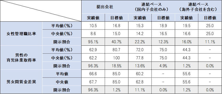 ①開示義務3指標(女性管理職比率、男性の育児休業取得率、男女間賃金差異)の開示状況