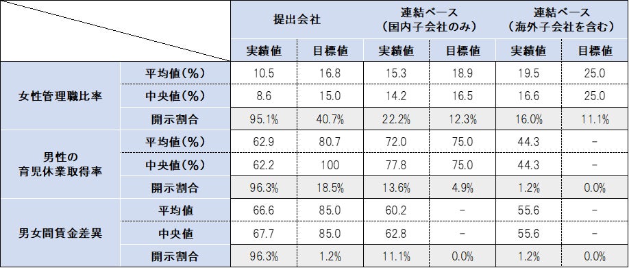 開示義務3指標以外においては、21.0%の企業が連結ベースでの開示を行っていました。全体として実績値の開示は多いものの、目標値を開示している企業の割合が低い傾向にありました。ただし、提出会社の開示で女性管理職比率の目標値を開示する企業の割合は40.7%と、他の2指標より開示する企業が多い傾向がみられました。