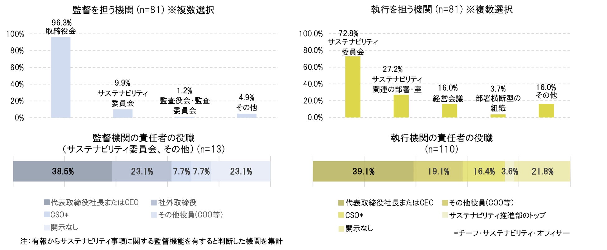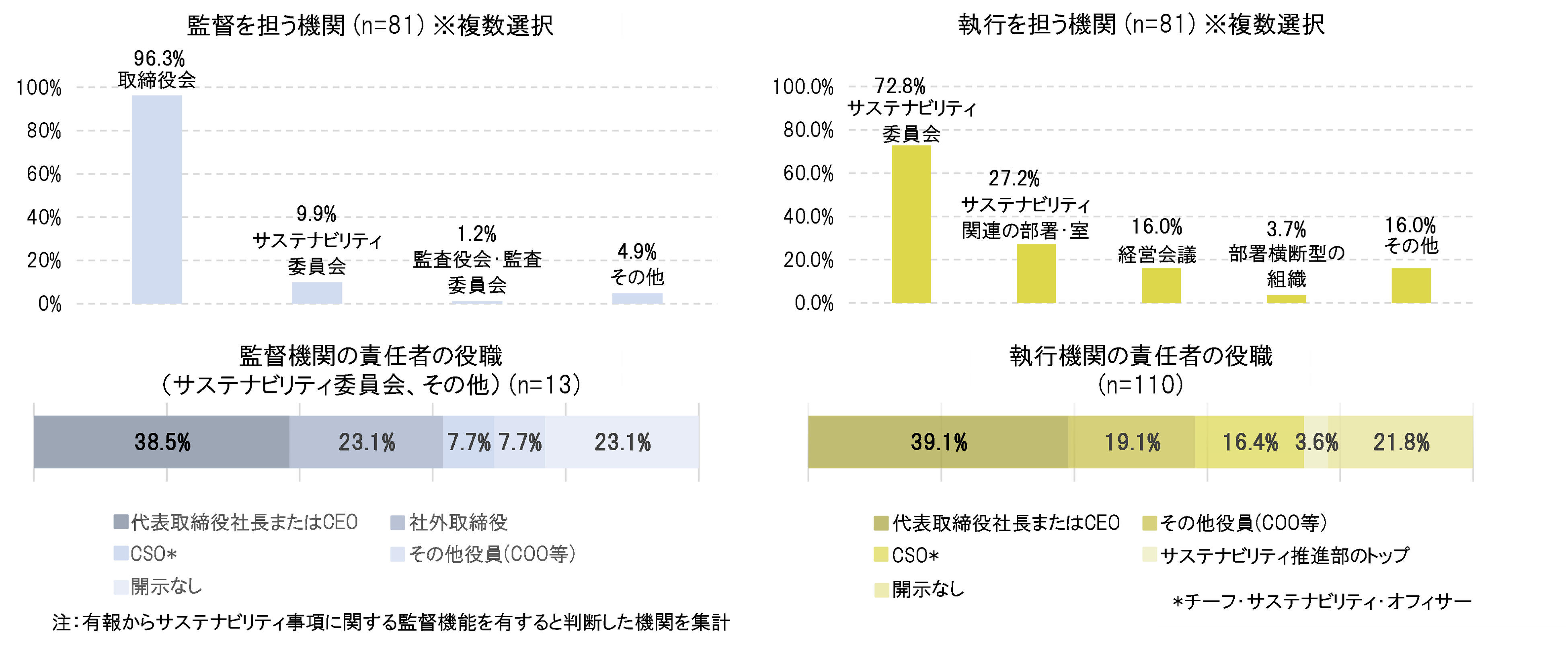 一方、執行体制では「サステナビリティ委員会」を設置していることを記載する企業は72.8%となり、執行機関のトップは「代表取締社長またはCEO」が最も多く、「その他の社内役員」が次に続きます。