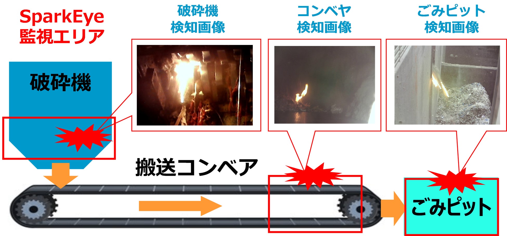 「SparkEye®」は、画像認識AIによりカメラ映像から火花・火炎を自動検知(最短0.05秒)し、アラート発報や自動散水設備等との連携によって、火災の発生・延焼リスク低減を支援するシステムです。カメラ映像による検知のため、ガラスやアクリル越しの設置にも対応し、火災リスクの高い破砕機周辺やベルトコンベア上などの監視にも適用可能です。さらに、検知データ(検知画像、日時、検知開始・終了時刻等)を可視化でき、現場での分析・再発防止にも活用できます。