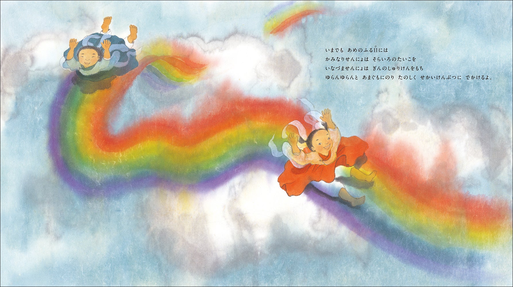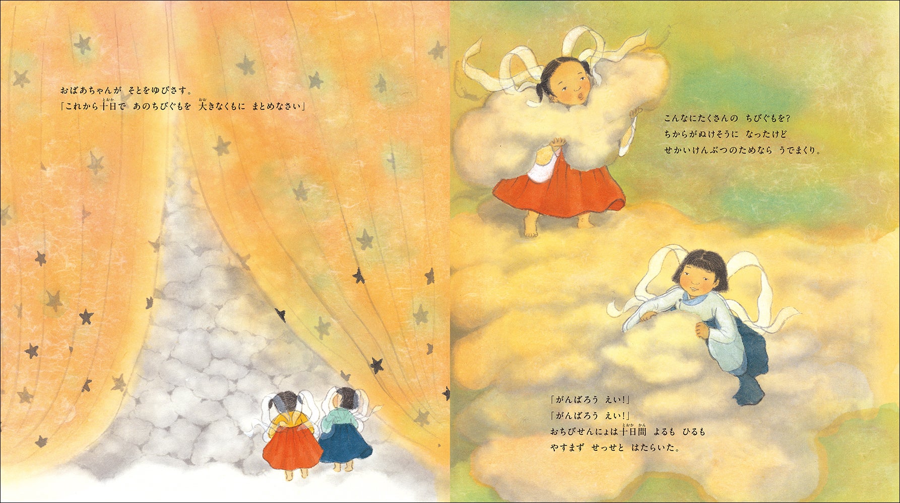 雲をつくるしごとにたいくつしたふたりのおちび仙女が、外の世界へ旅にでるお話です。