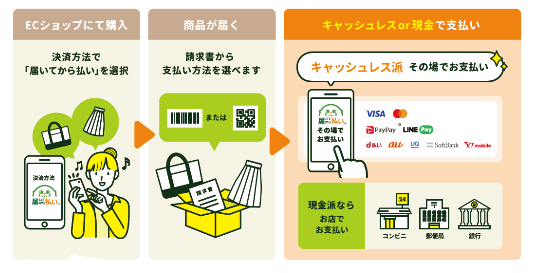 「届いてから払い」とは、ECサイトや通販などでのお買い物で、「商品が届いてから、豊富な選択肢の中よりお支払い方法を決める」ことができる新しい後払いサービスです。従来どおり現金によるコンビニでの支払いや銀行振込、郵便振替はもちろん、クレジットカード、スマホ決済、キャリア決済でのお支払いができるのが特徴です。