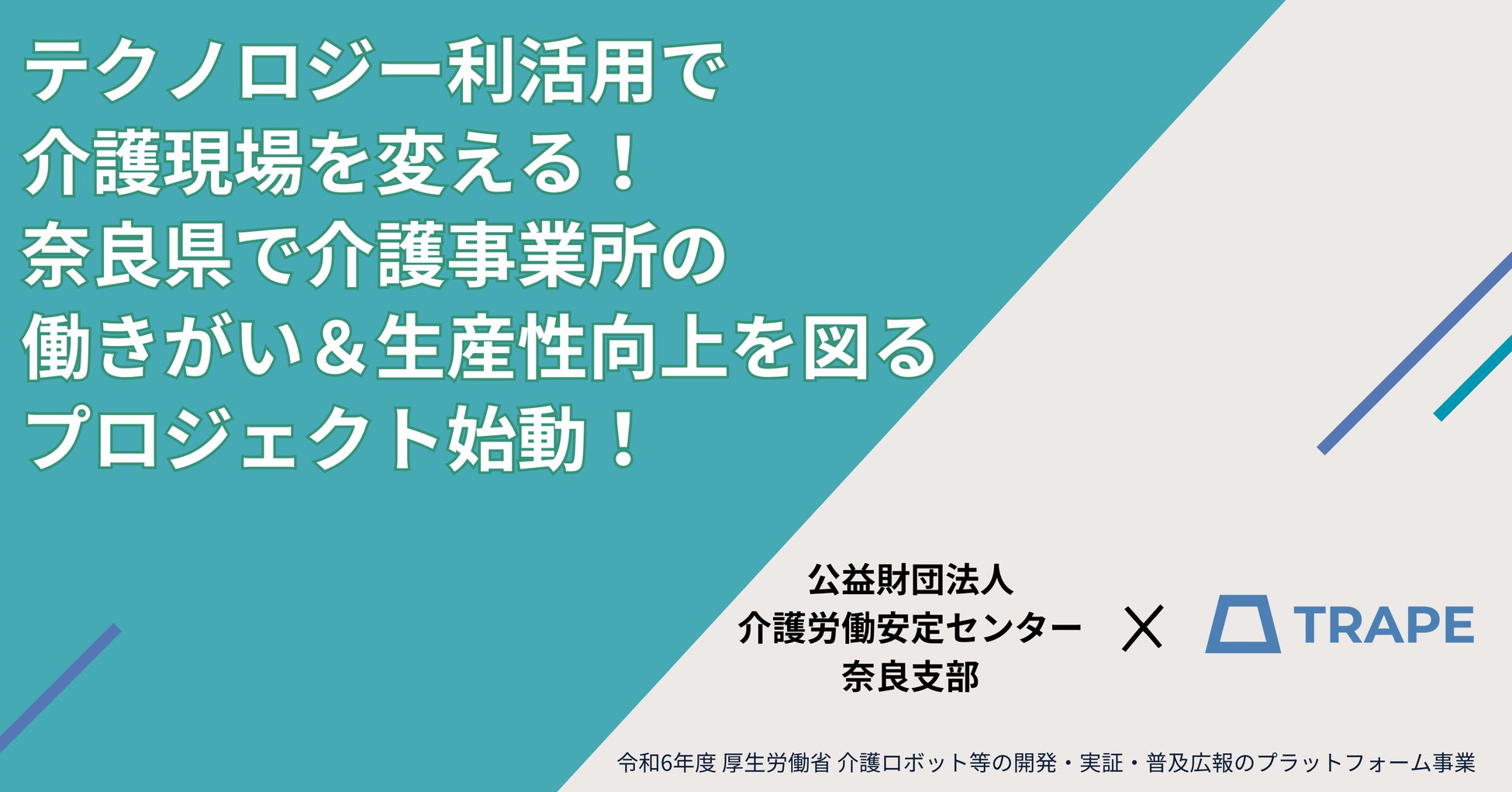 介護における生産性向上ガイドライン作成など、2017年から介護分野の生産性向上のためのさまざまな国の施策づくりで中心的な役割を担い、ウェルビーイングに溢れた介護事業所を創出するために「生産性向上」「働きがい向上」「リーダー育成」の3つを一度に実現することができる生産性向上伴走支援サービス「Sociwell(ソシウェル)」を展開している株式会社TRAPE(本社:大阪府大阪市、代表取締役社長:鎌田大啓)は、この度令和6年度 厚生労働省 介護ロボット等の開発・実証・普及広報のプラットフォーム事業(以下PF)においてPF奈良相談窓口における業務アドバイザー業務委託契約を公益財団法人介護労働安定センター奈良支部様と締結いたしました。
