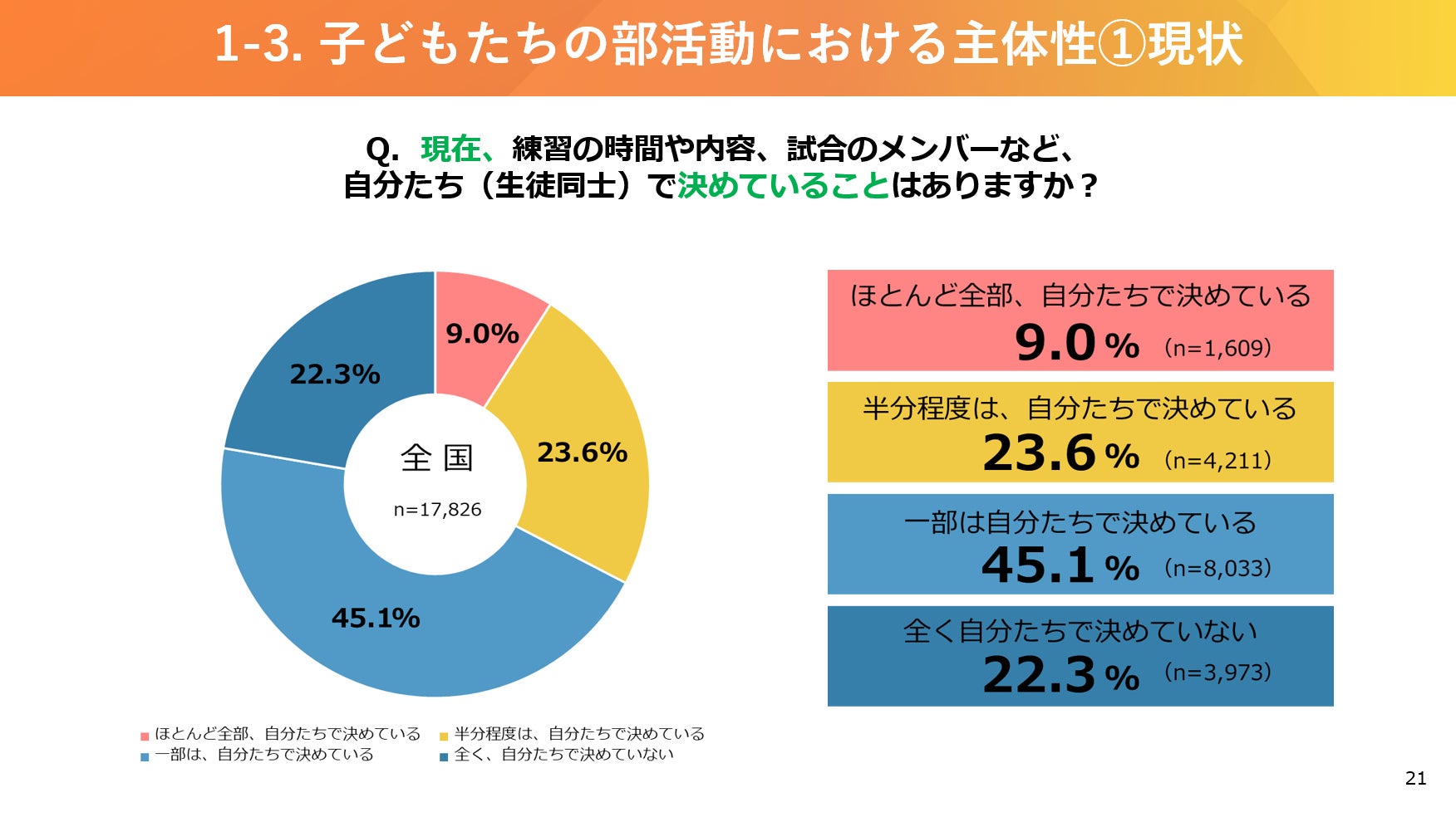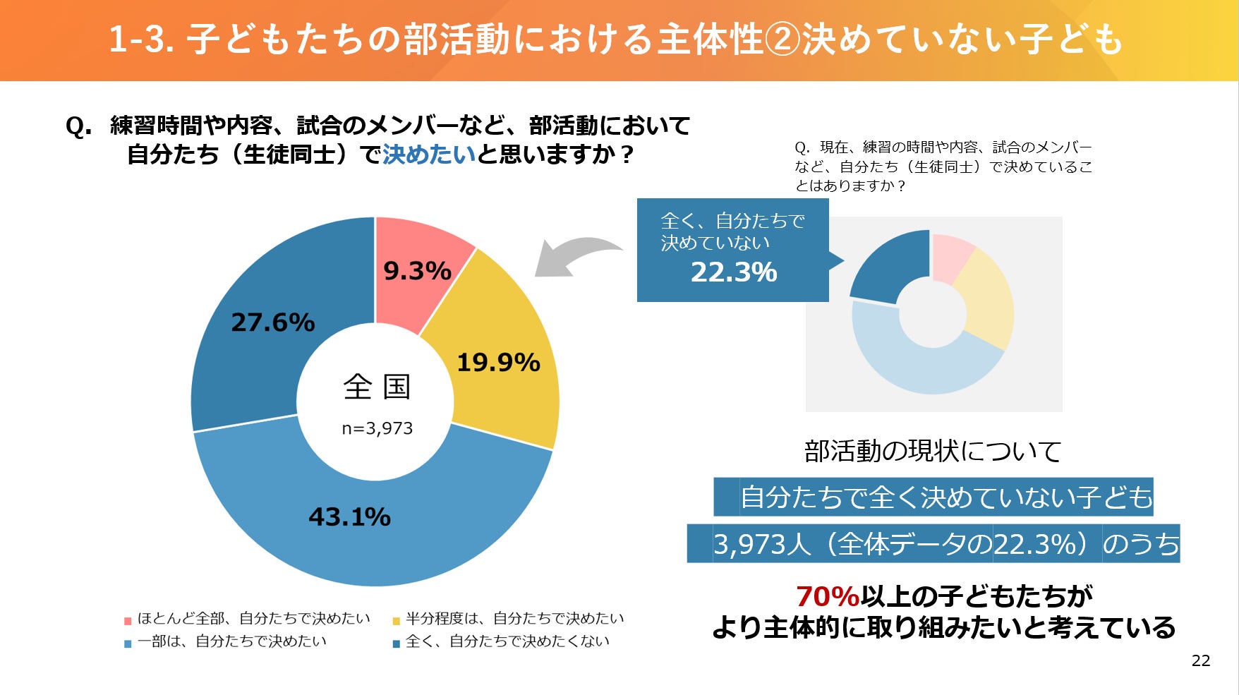 部活動において「全く自分たちで決めていない」生徒は22.3%。
