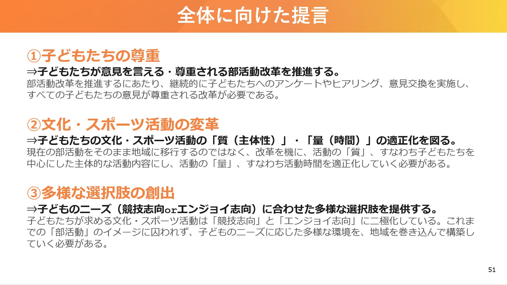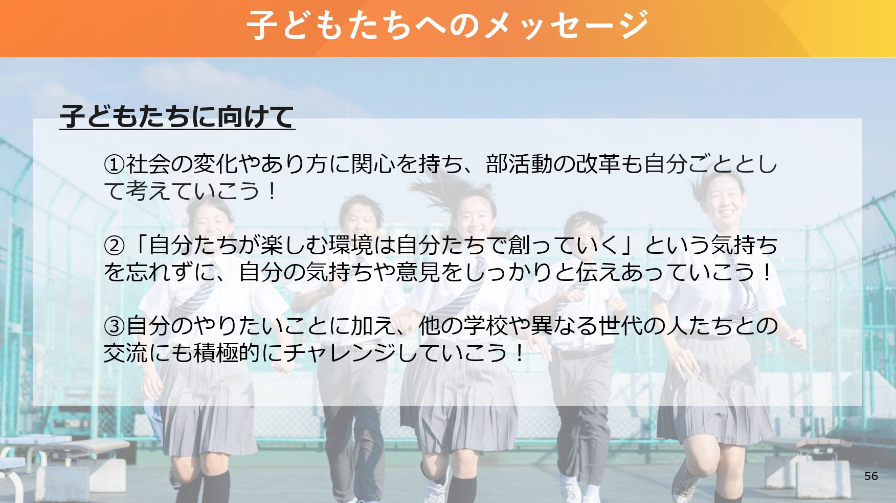 こども基本法が2023年4月1日から施行され、部活動改革においてもその理念に基づき、子どもたちの声や主体性が尊重され、子どもたち一人ひとりの個性や志向に合わせた多様な環境を構築することが大切です。