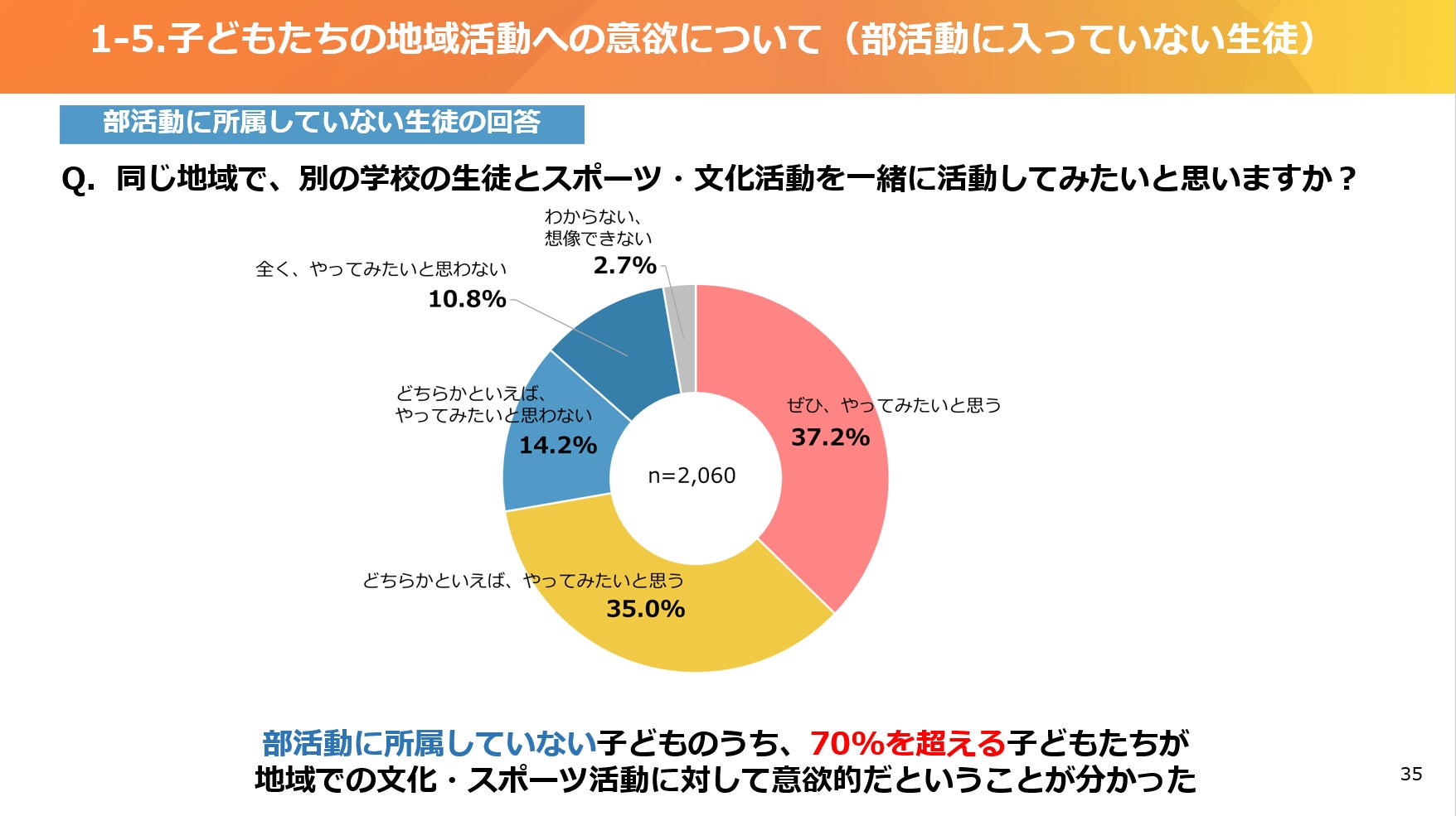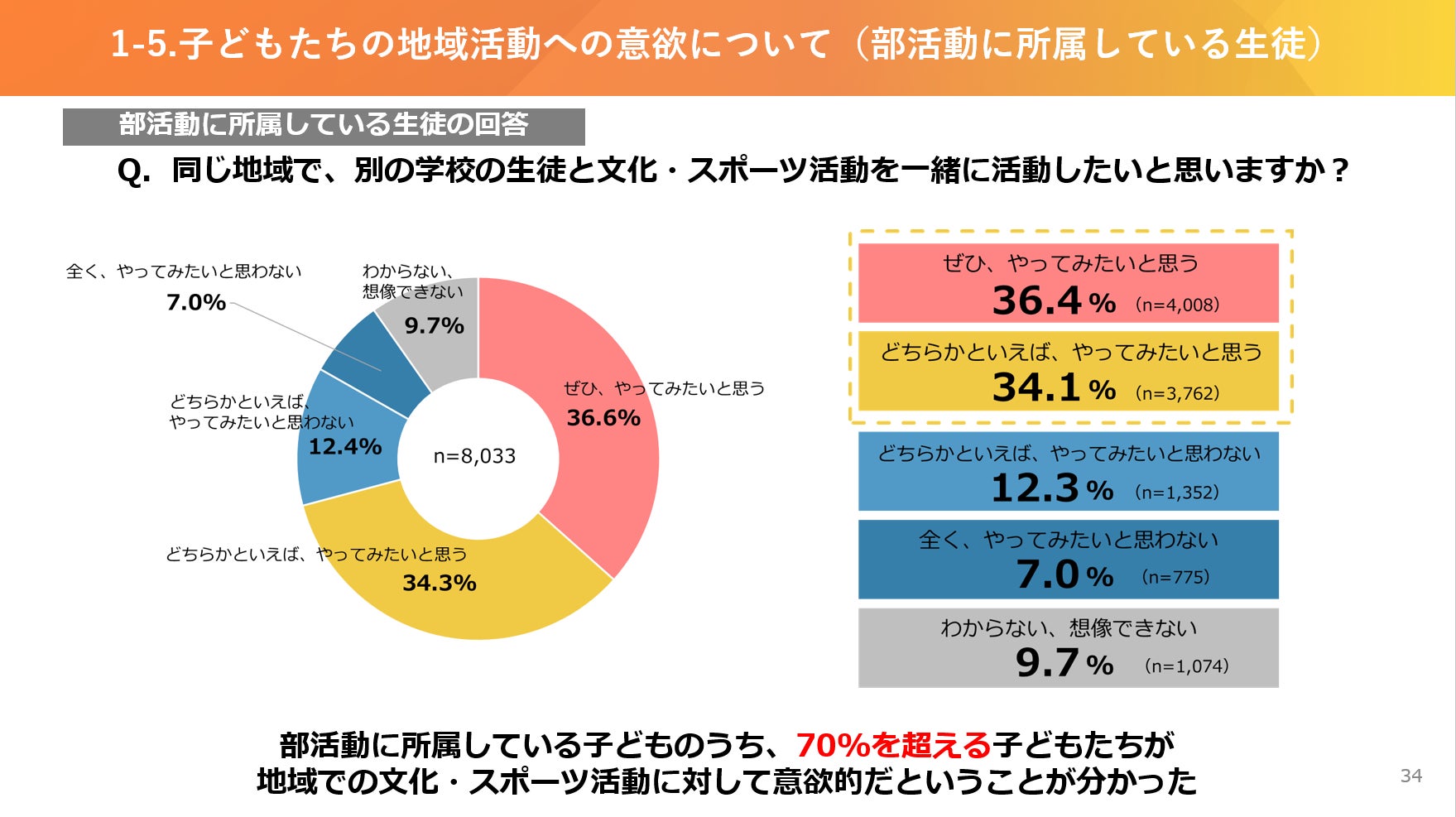 子どもたちのニーズは「競技志向」「エンジョイ志向」で二極化。部活動に所属している生徒・所属していない生徒も、地域で活動してみたい生徒は70%以上。