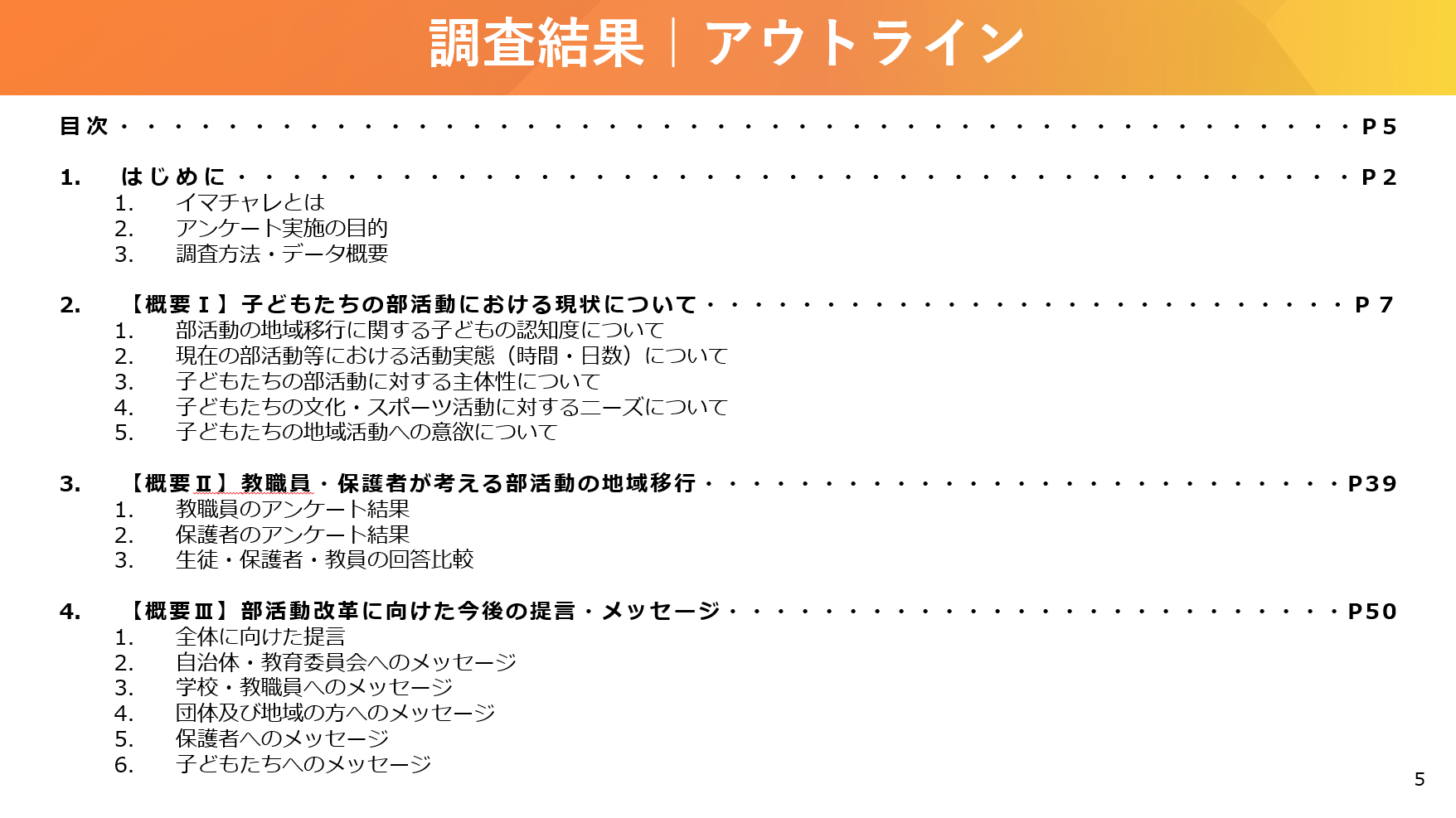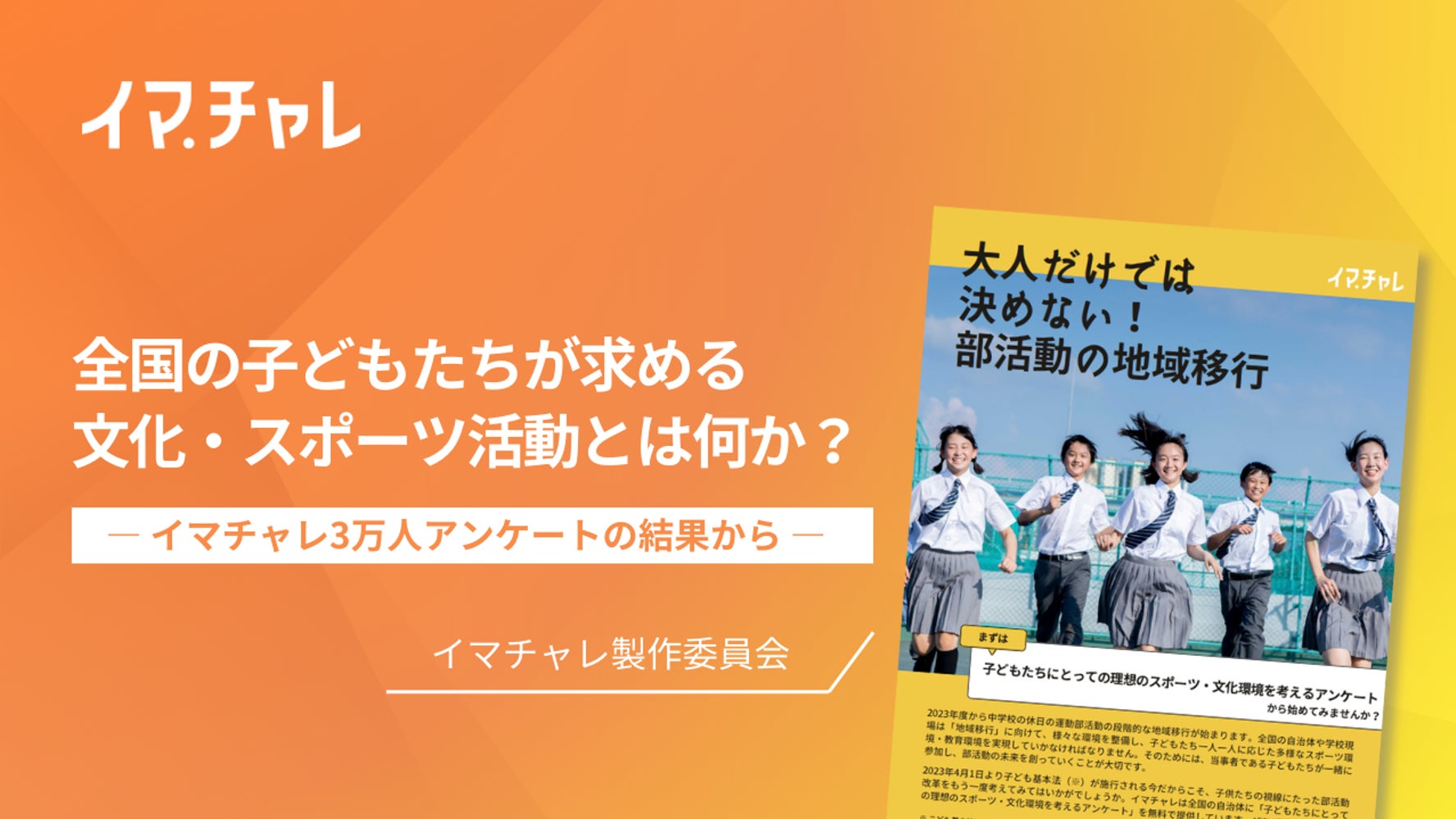 本アンケート結果を元に、今後イマチャレ製作委員会としても、全国の自治体・学校・地域クラブの皆様と連携をしながら、当事者である子どもたちと共に、これからの時代における新たな文化・スポーツ環境の実現に向けて努めてまいります。