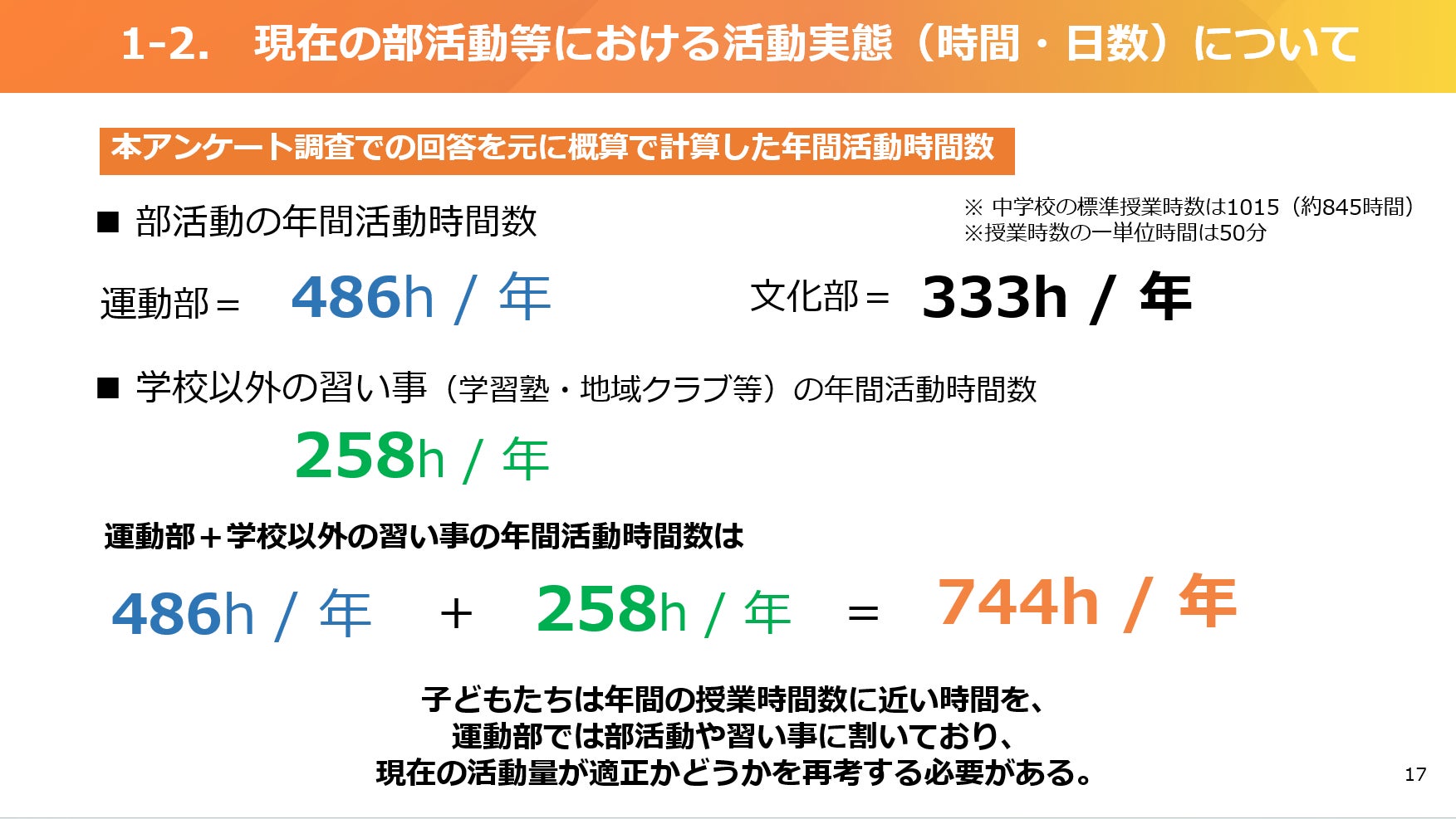 運動部+学校以外の習い事の年間活動時間数は744h/年(概算)。年間の授業時間数(約845時間)に近い時間を費やしている。