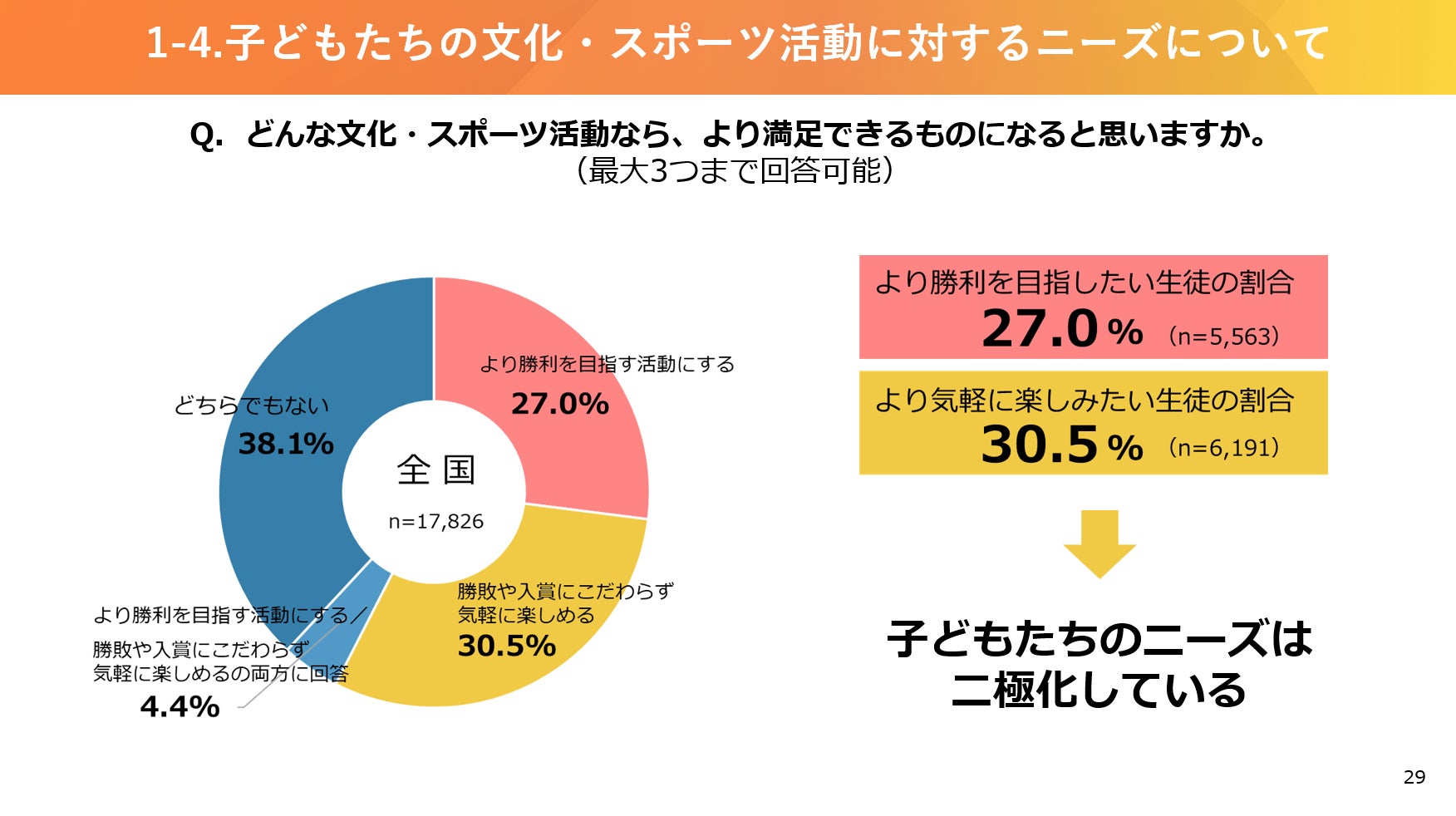 子どもたちの文化・スポーツ活動に対するニーズは「より勝利を目指したい生徒(27.0%)」と「より気軽に楽しみたい生徒(30.5%)」で二極化している。