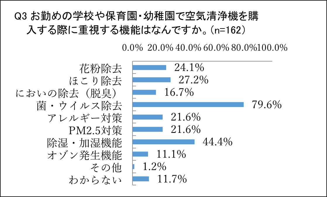 「お勤めの学校や保育園・幼稚園で空気清浄機を購入する際に重視する機能はなんですか」という質問では、「菌・ウイルス除去」が79.6%と最も高い結果となりました。やはり、感染対策として空気清浄機の導入をされた方が多いようです。