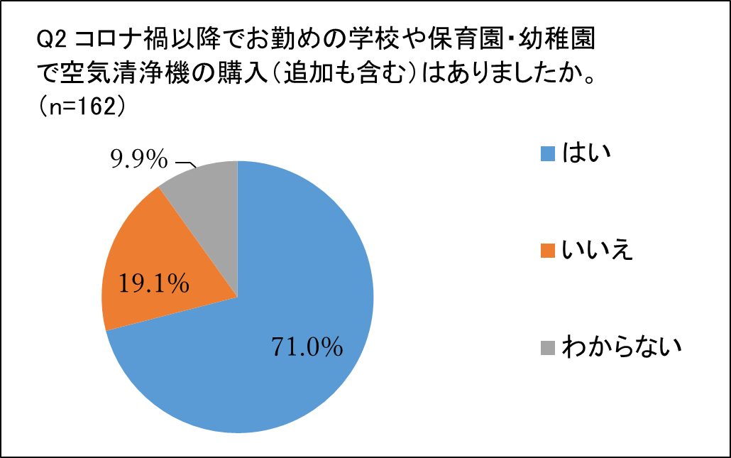 - コロナ禍以降、学校や保育園・幼稚園で空気清浄機を購入した施設は7割以上