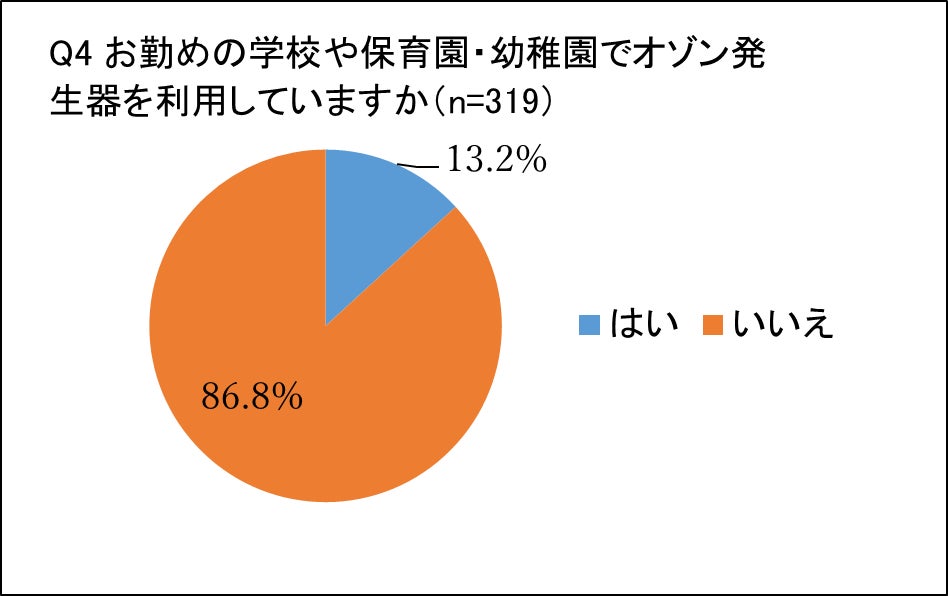 「お勤めの学校や保育園・幼稚園でオゾン発生器を利用していますか」と質問したところ、「利用している」と答えた方は13.2%と1割程度となりました。