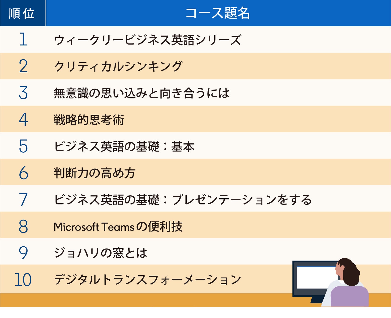今年のランキングでは、過去2年に渡って1位だった「クリティカルシンキング」に代わり「ウィークリービジネス英語シリーズ」が1位にランクインしました。ほかにもビジネス英語に関する3コースがトップ10に入るなど、日本のユーザーの間で英語関連のスキルが一層高い関心を得ていることが示されました。また、「クリティカルシンキング」や「判断力の高め方」など、ビジネスでの判断力に関わるコースも、昨年に引き続き上位にランクインしています。