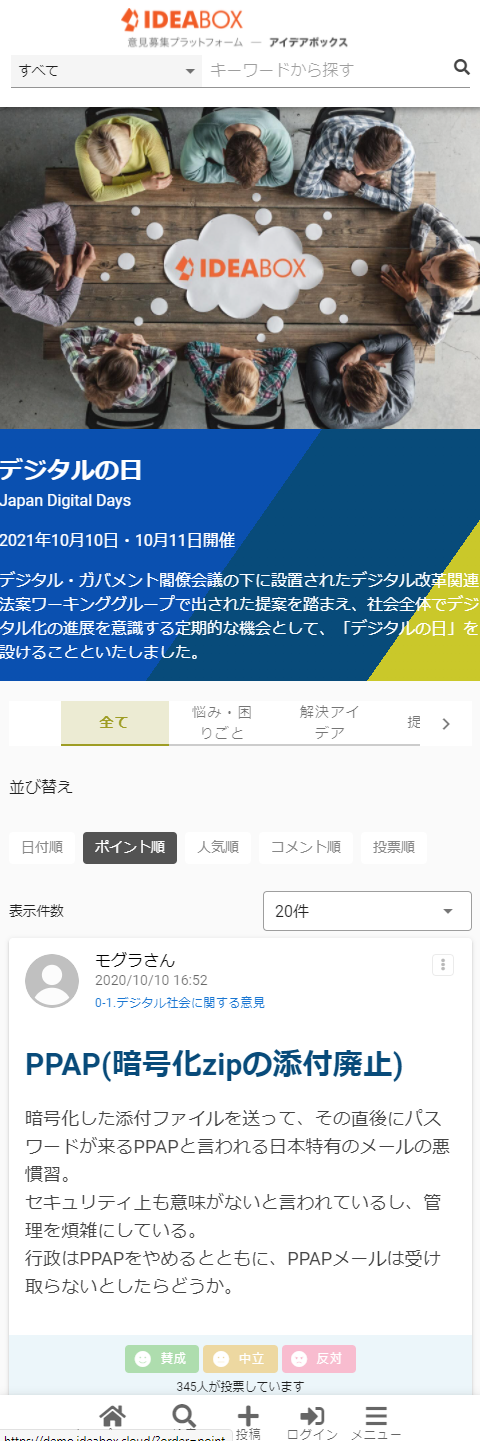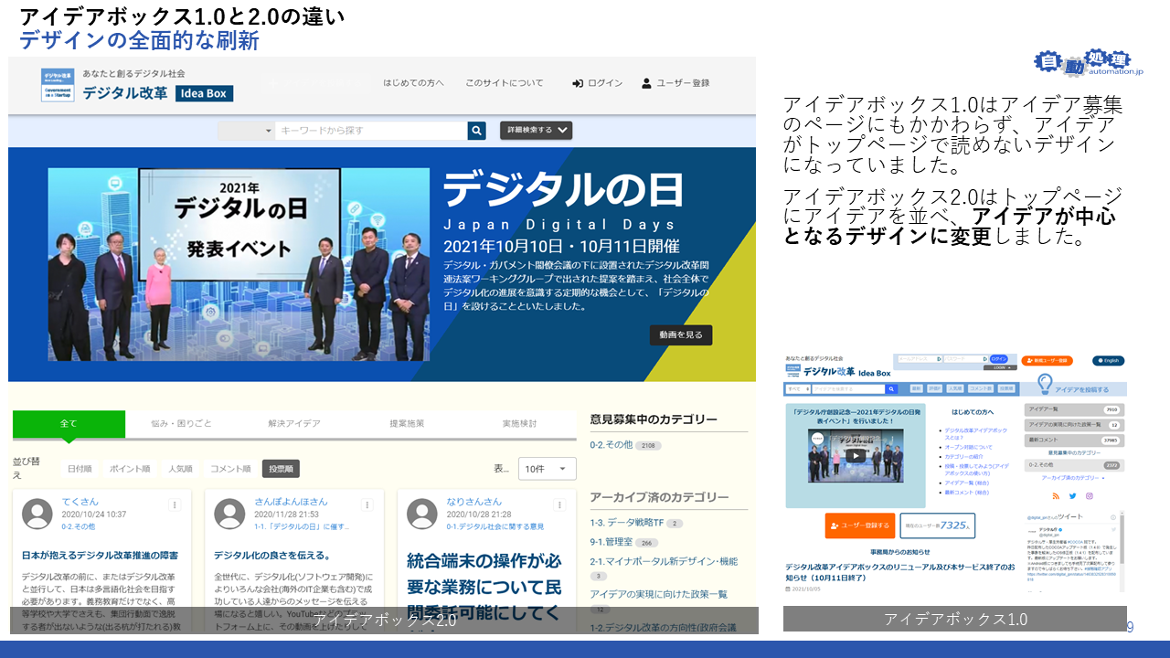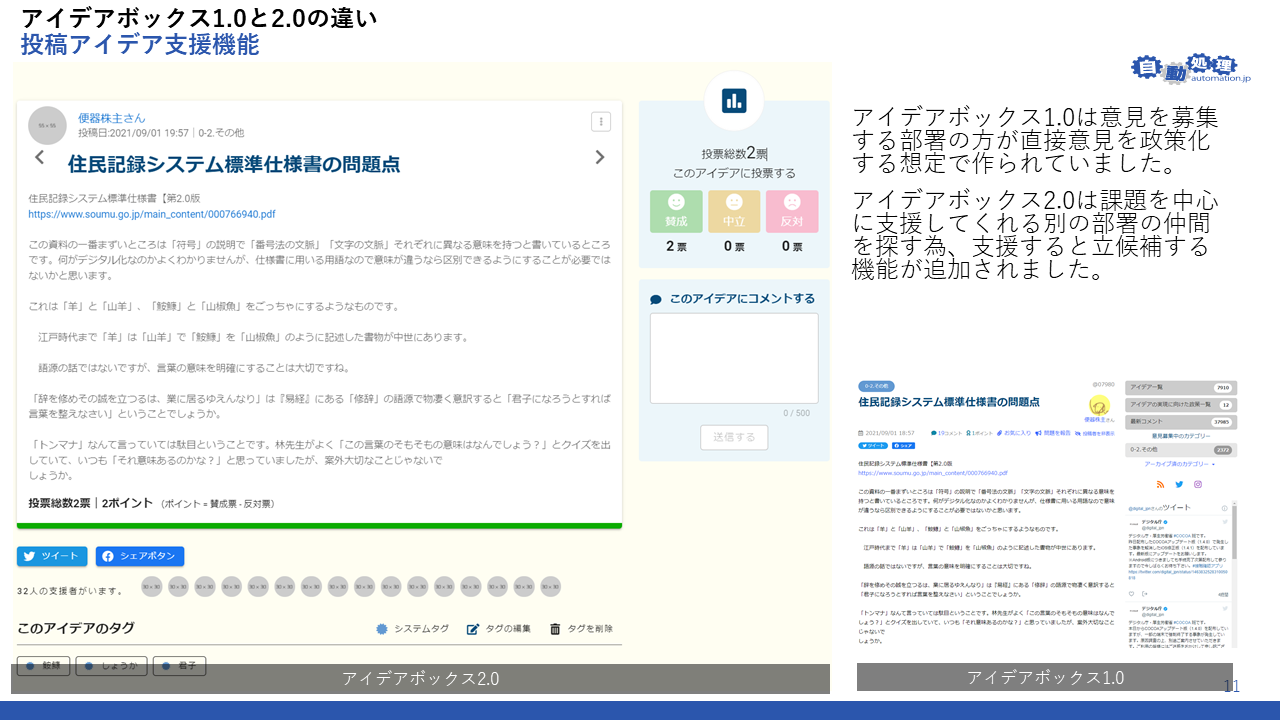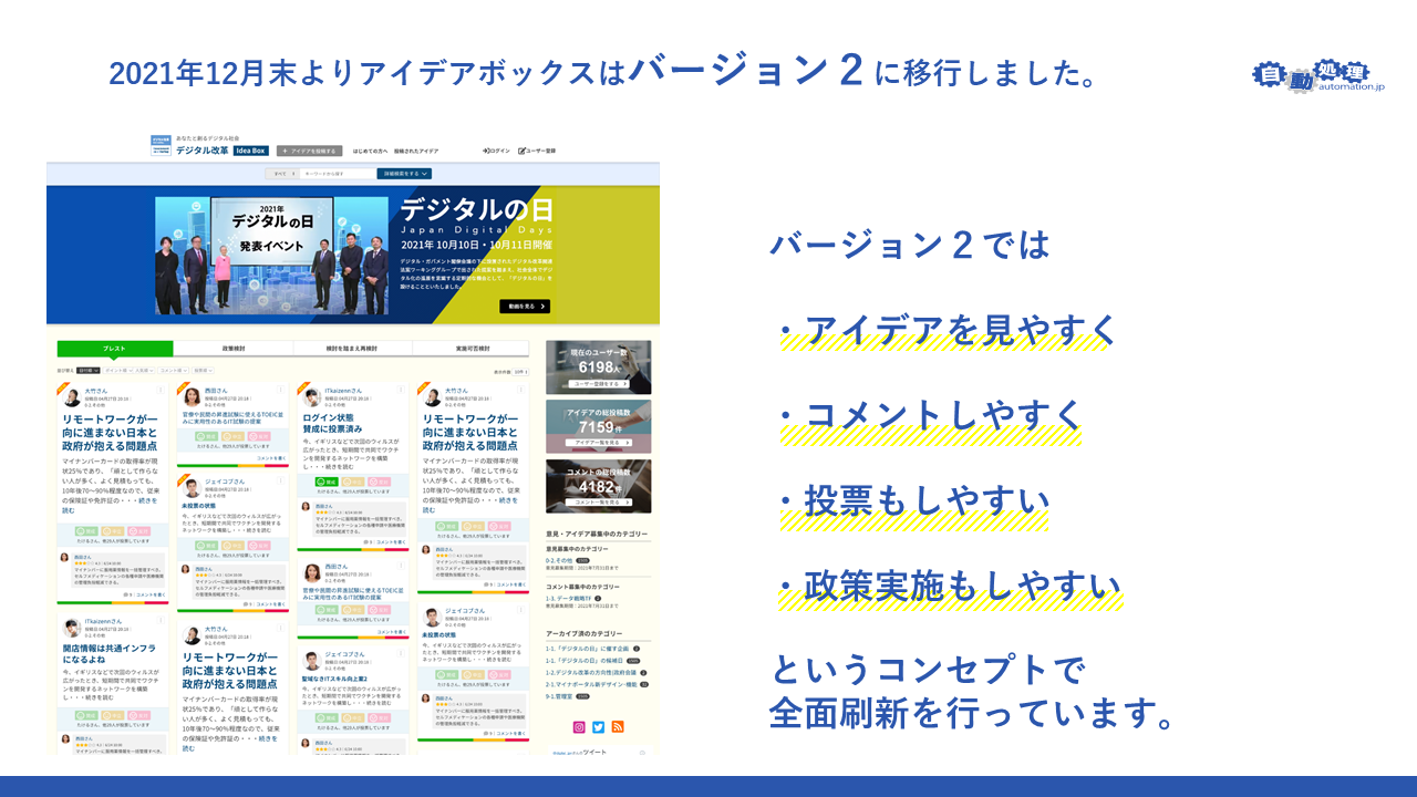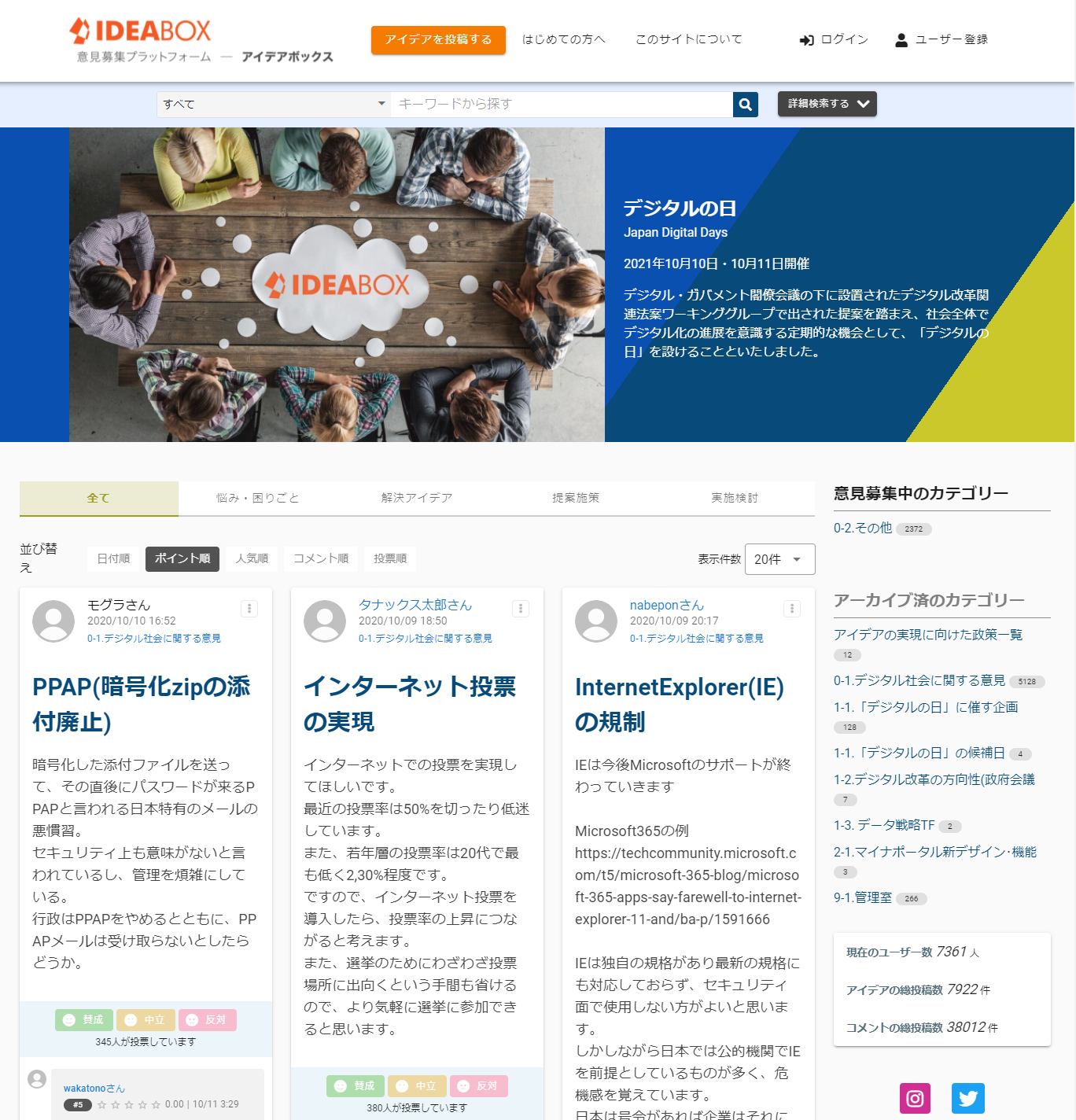 現在、昨年実施されたデジタル改革アイデアボックスではデジタル庁において、国民から意見を集める仕組みとして、デジタル庁立ち上げ前の意見募集の仕組みとして採用され、7325人の参加者、7910件のアイデア投稿、37985件のコメント投稿を集めた実績があり、国民同士の意見交換が主体的な参加を促し、楽しく政策について考えるきかっけになるとご好評いただいております。