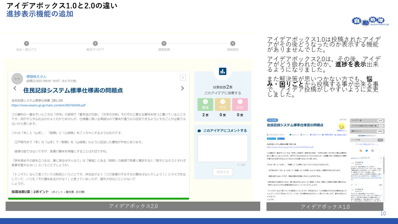 アイデアボックス1.0は意見を募集する部署の方が直接意見を政策化する想定で作られていました。