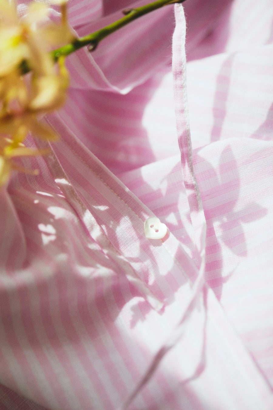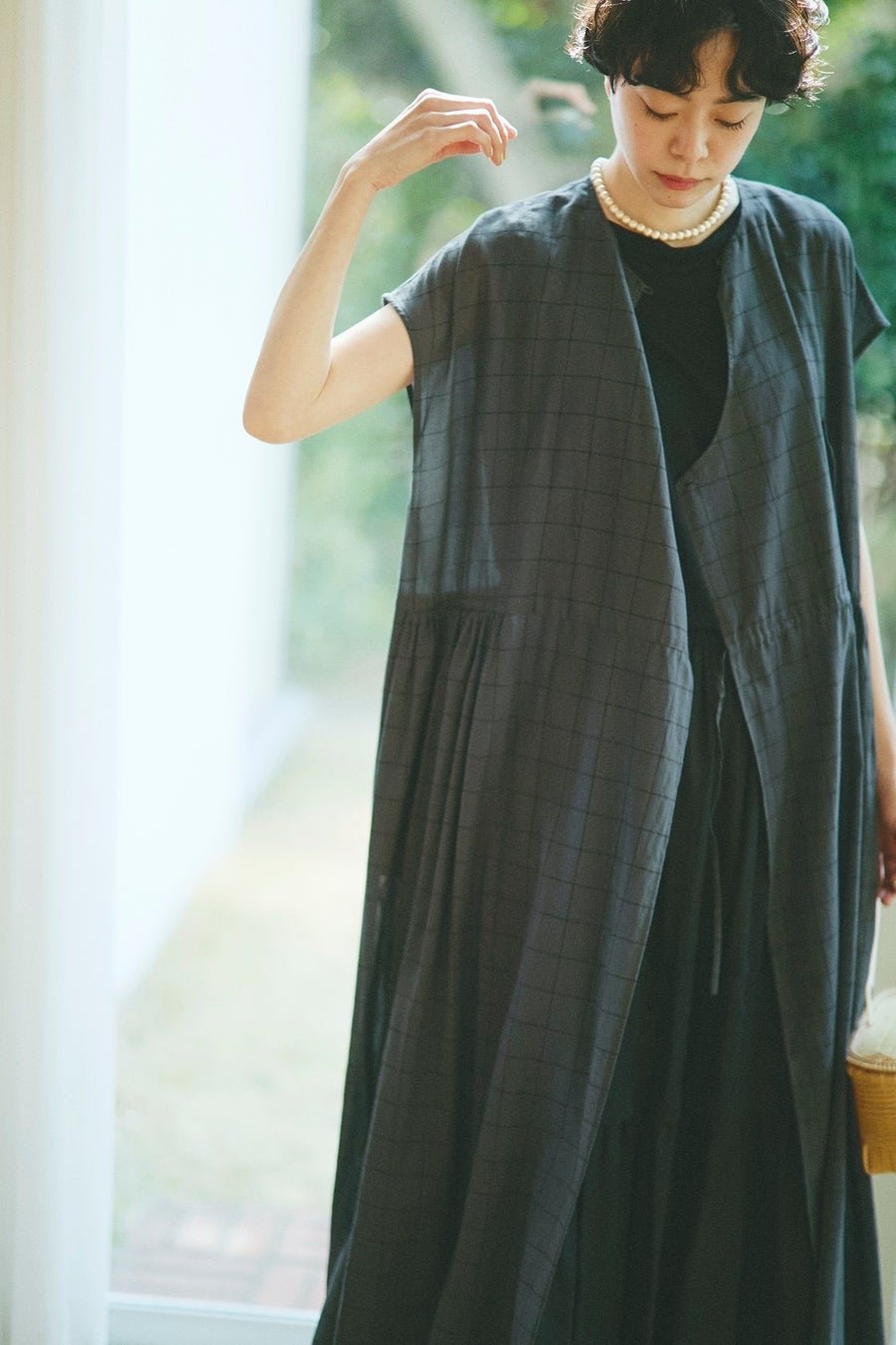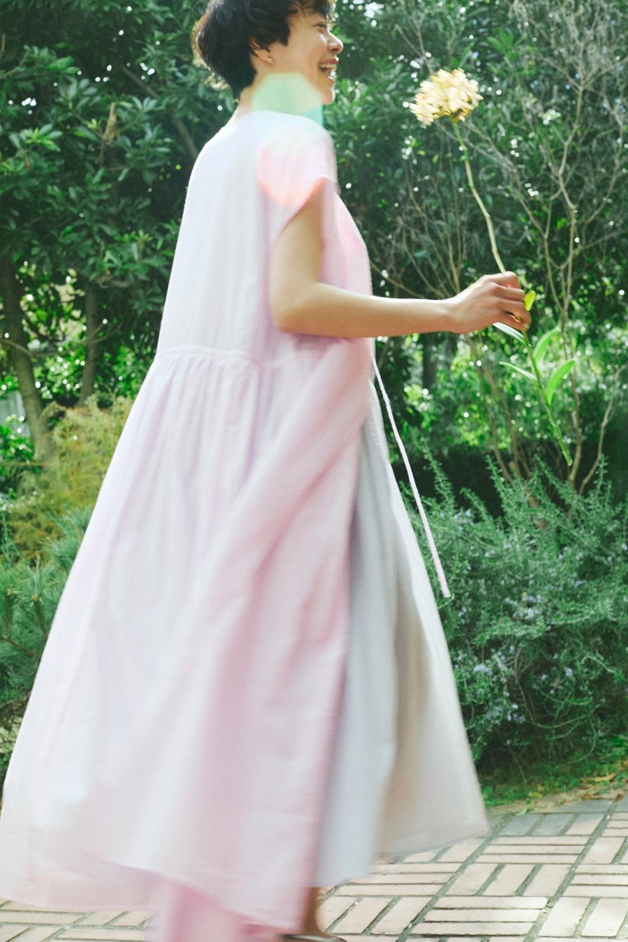 表情を出すために麻を加えた、ナチュラルで軽い雰囲気の綿麻素材を使用。フロントボタンをとめる事で一枚着としても成り立つデザインに仕上げたカシュクールワンピース。スカートの内側にハート型の貝ボタンを施した、細部までこだわりを込めた一着。