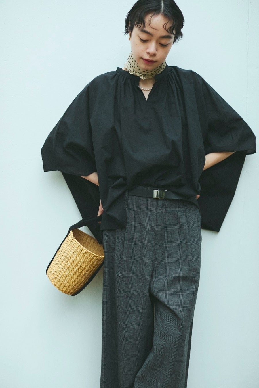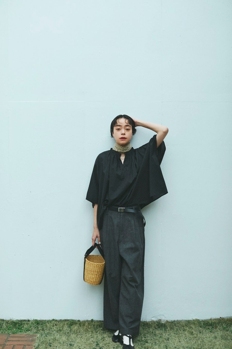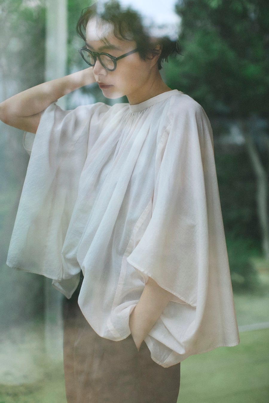 吸湿速乾に優れた温かみのある素朴な風合いが特徴のインド綿を使用。襟ぐりにたっぷりとギャザーを寄せた、リラックス感のあるポンチョシルエットのブラウス。前後どちらでも着られる2WAYデザインで、それぞれのカラーに合わせてセレクトした襟元のボタンがポイントに。