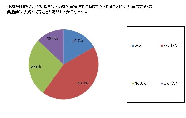 - 顧客や商談管理の入力など事務作業に時間をとられることにより、通常業務(営業活動)に支障がでることがある人が、60%