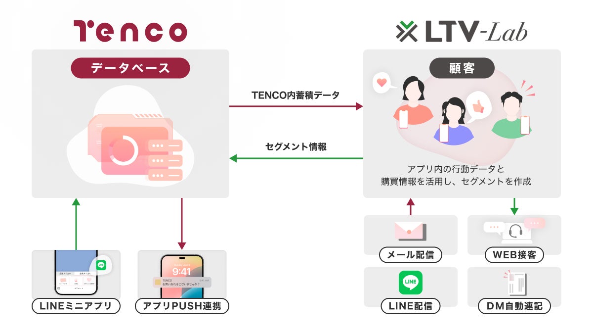本標準連携では、「LTV-Lab」に蓄積された EC・店舗の顧客に紐づくデータ(顧客情報・購買情報・EC上の行動履歴など)と「TENCO」に蓄積された情報(アプリダウンロード・アンケート・クーポン・抽選情報など)を統合し、シナリオに基づくセグメント化を可能にします。