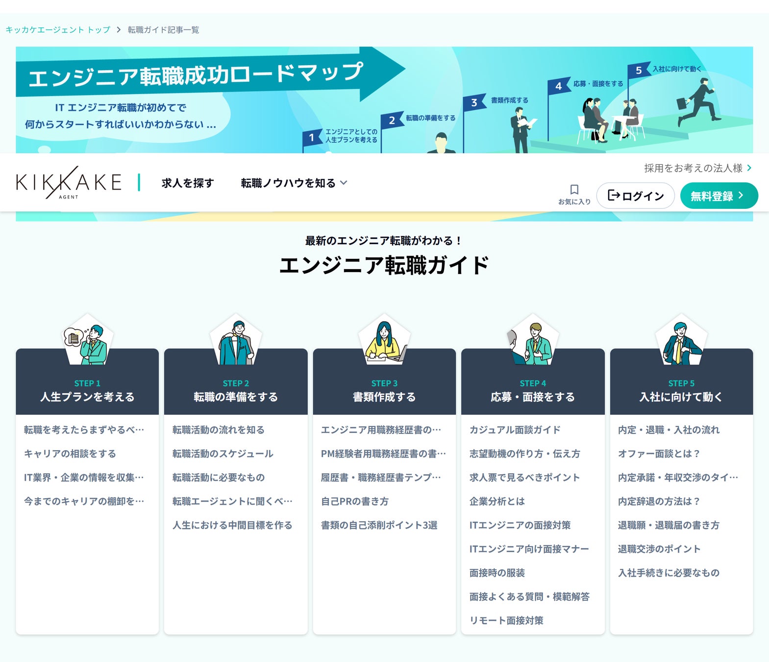 ITエンジニア転職をする上で何から手を付けてよいか分からない方向けに、転職活動の進め方や準備しておくべきことを全5ステップに分けて詳しく解説。転職が初めての方でもスムーズに、かつ最適なステップで転職活動が進行できるようITエンジニアに特化した転職エージェントが持つ知識や転職成功に導くコツをすべて凝縮しています。