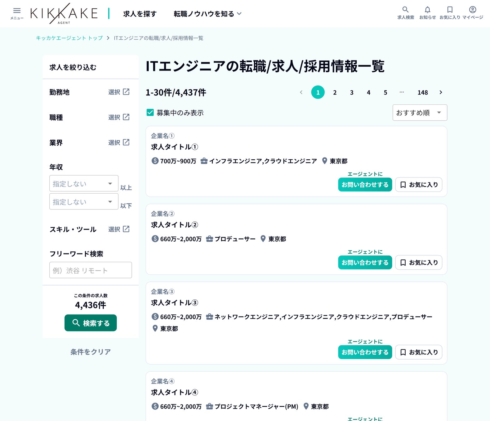 求人検索では、企業が募集している求人情報を取得できます。年収や勤務地、職種など任意の絞り込みが可能となっており、希望とマッチする求人情報を閲覧可能です。また、気になる求人があればキッカケエージェントへのお問い合わせが行えるだけでなく、求人情報の詳細を確認したい場合は個別の求人情報ページに遷移し内容をチェックすることもできます。