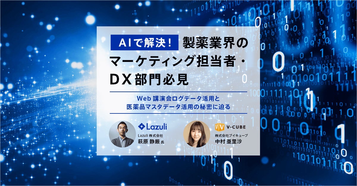 同ウェビナーは、製薬メーカーや医療機器メーカーのマーケティングやDXの担当者向けに、医薬品のマスタデータや名寄せ、データ管理・データ活用など、製薬業界のDXを推進するためのヒントを提供するものです。 7月14日(木)13:00からの1時間のウェビナーには、Lazuliの代表取締役 萩原と、株式会社ブイキューブの中村氏が登壇します。