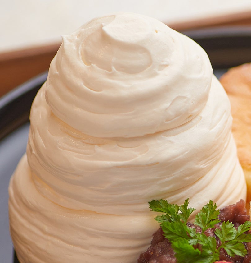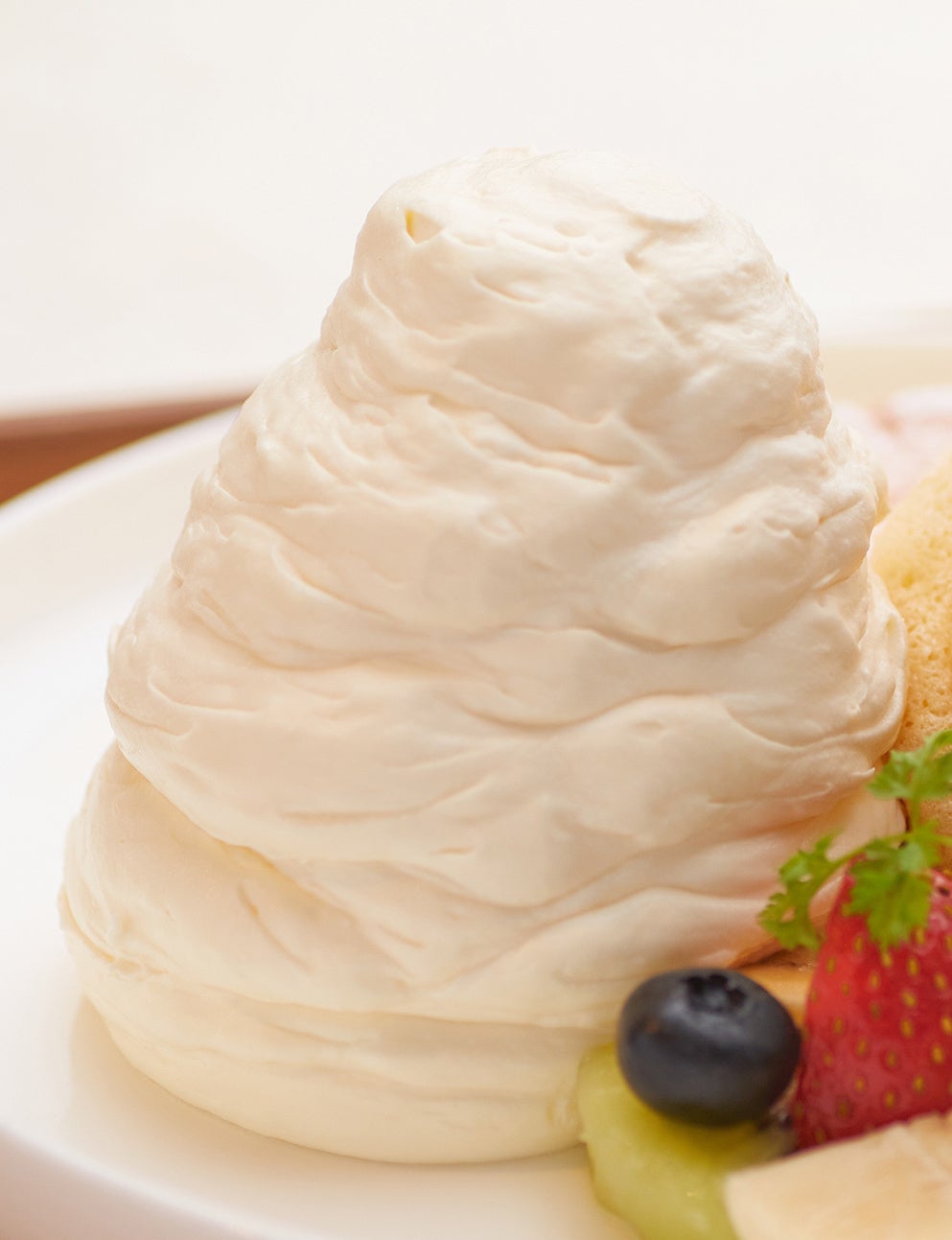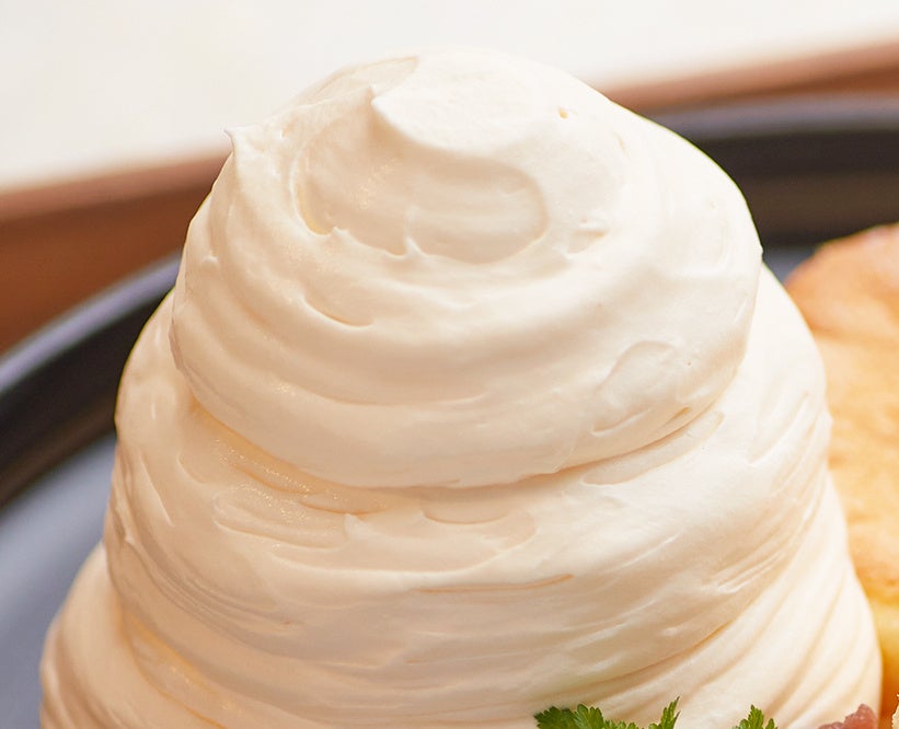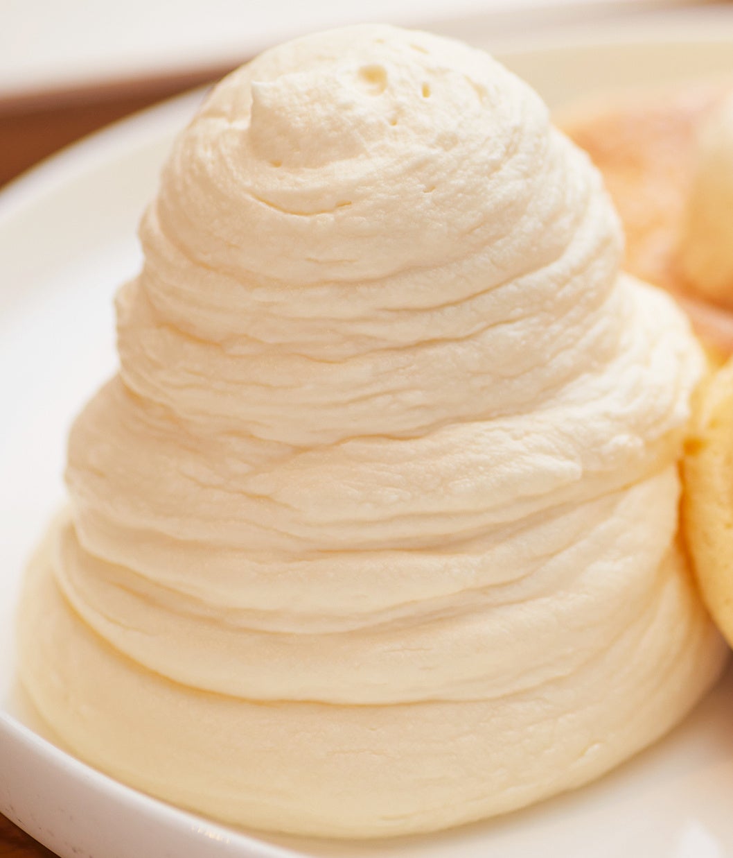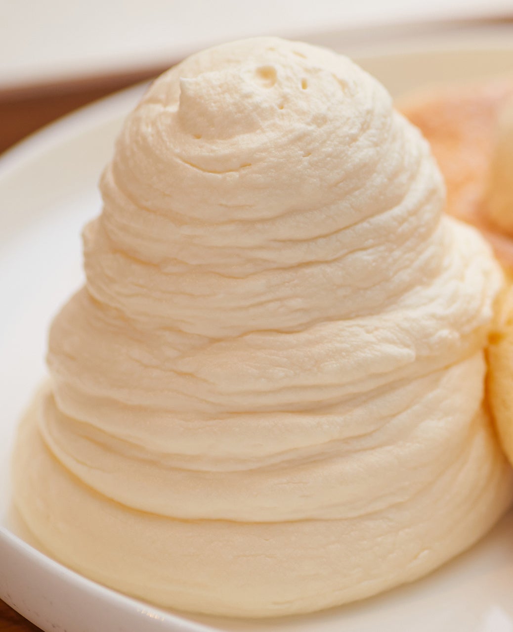 「泡ミルクセーキパンケーキ」は、遺伝子組み換えでない飼料で育てた親鶏からうまれたこだわりのたまごを使用し甘さや口当たり、口溶けなど、細部にこだわって作り上げました。