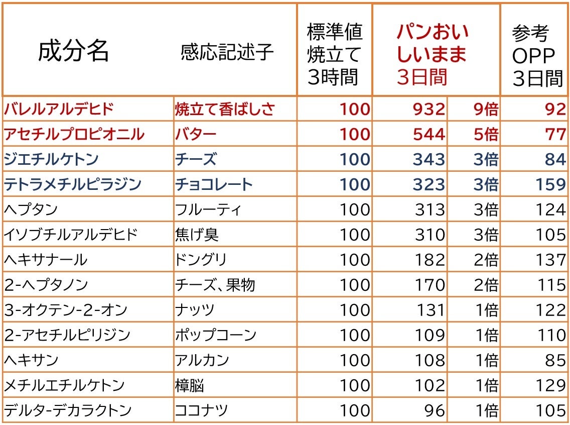 焼けた小麦の香り成分が9倍以上、バターの香り成分が5倍以上、チョコレートの香り成分が3倍以上、増えていることが確認されています(※試験結果はHP参照)。