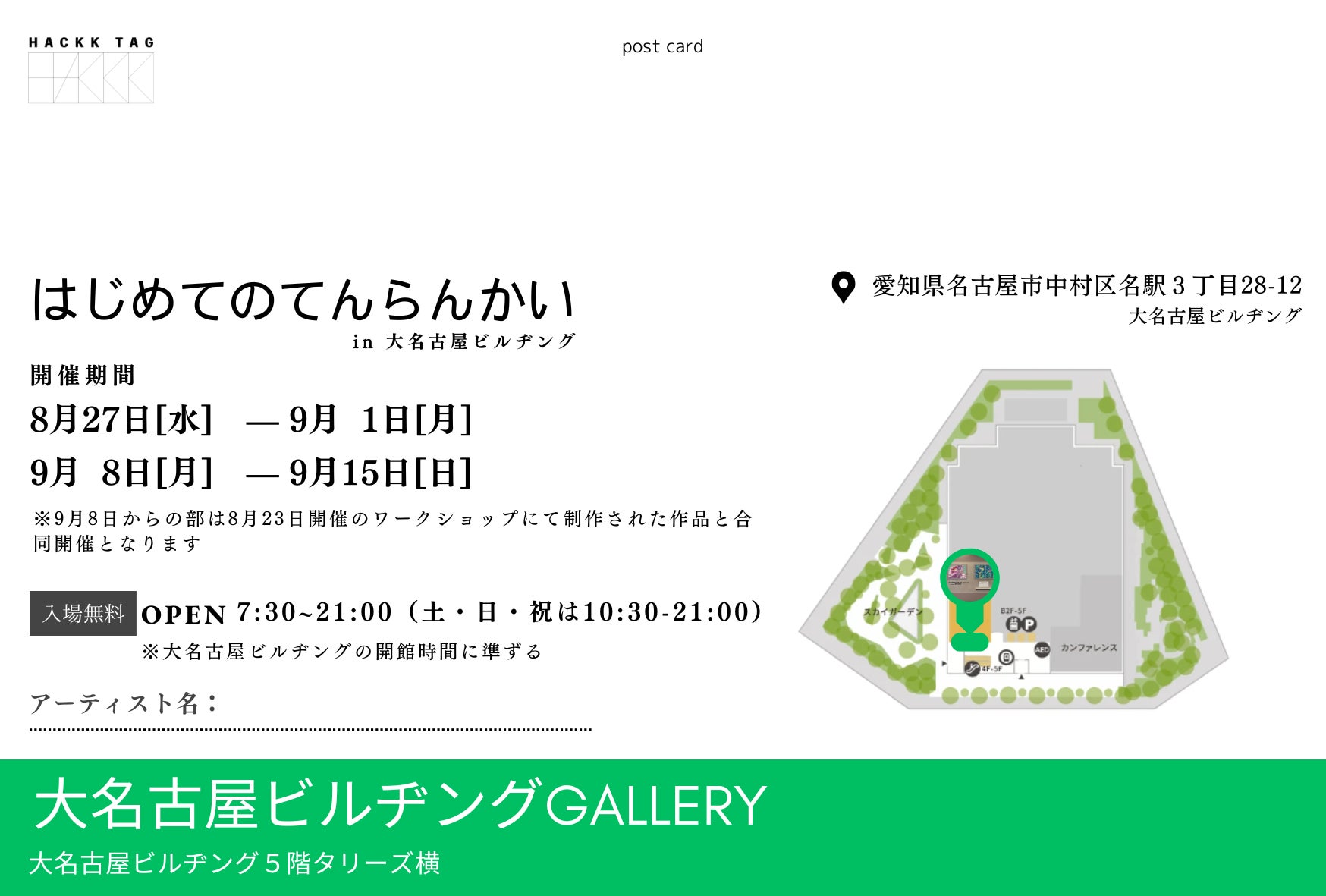 8月2日(土)、8月23日(土)に実施したワークショップで制作した作品をその場で撮影・データ化し、大名古屋ビルヂングGALLERYにてデジタル展示を行います。参加者には案内状(はがきサイズDM)をお渡ししており、家族や知人・友人を「はじめてのてんらんかい」に招待することが可能です。