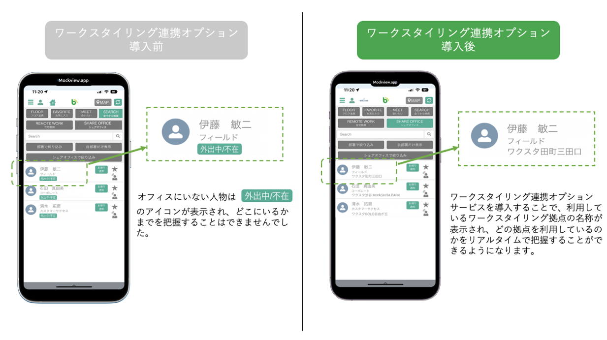 本オプションサービスの導入により、自社オフィス以外のワークプレイスの利用状況が把握できるようになるだけでなく、「WORK STYLING」で勤務している社員の検索・表示機能によって、「WORK STYLING」における社員同士のコミュニケーションの促進にもつながります。