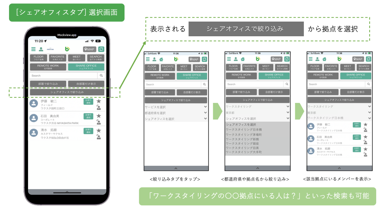 メイン画面に設置されている「シェアオフィスタブ」をタップすることで「WORK STYLING」に勤務する社員を絞り込んで表示することができるとともに、「WORK STYLING」勤務中は在宅勤務ボタンがシェアオフィス勤務アイコンに切り替わるなど、視認性という点でもわかり易いUIを備えております。